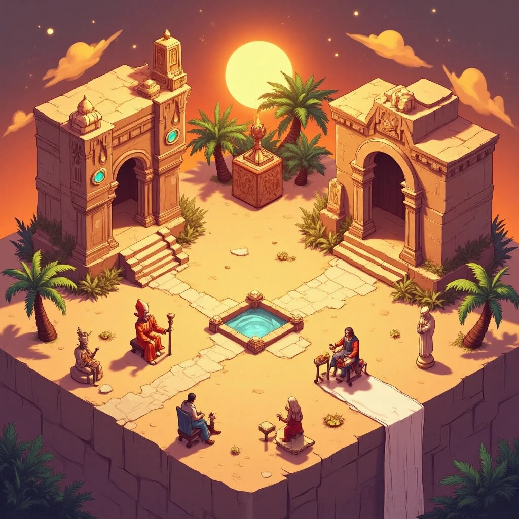 Isometric game scene designs, ancient desert ruins, crumbling temples, sand dunes, sun - bleached statues, warm oranges, mysterious aura.