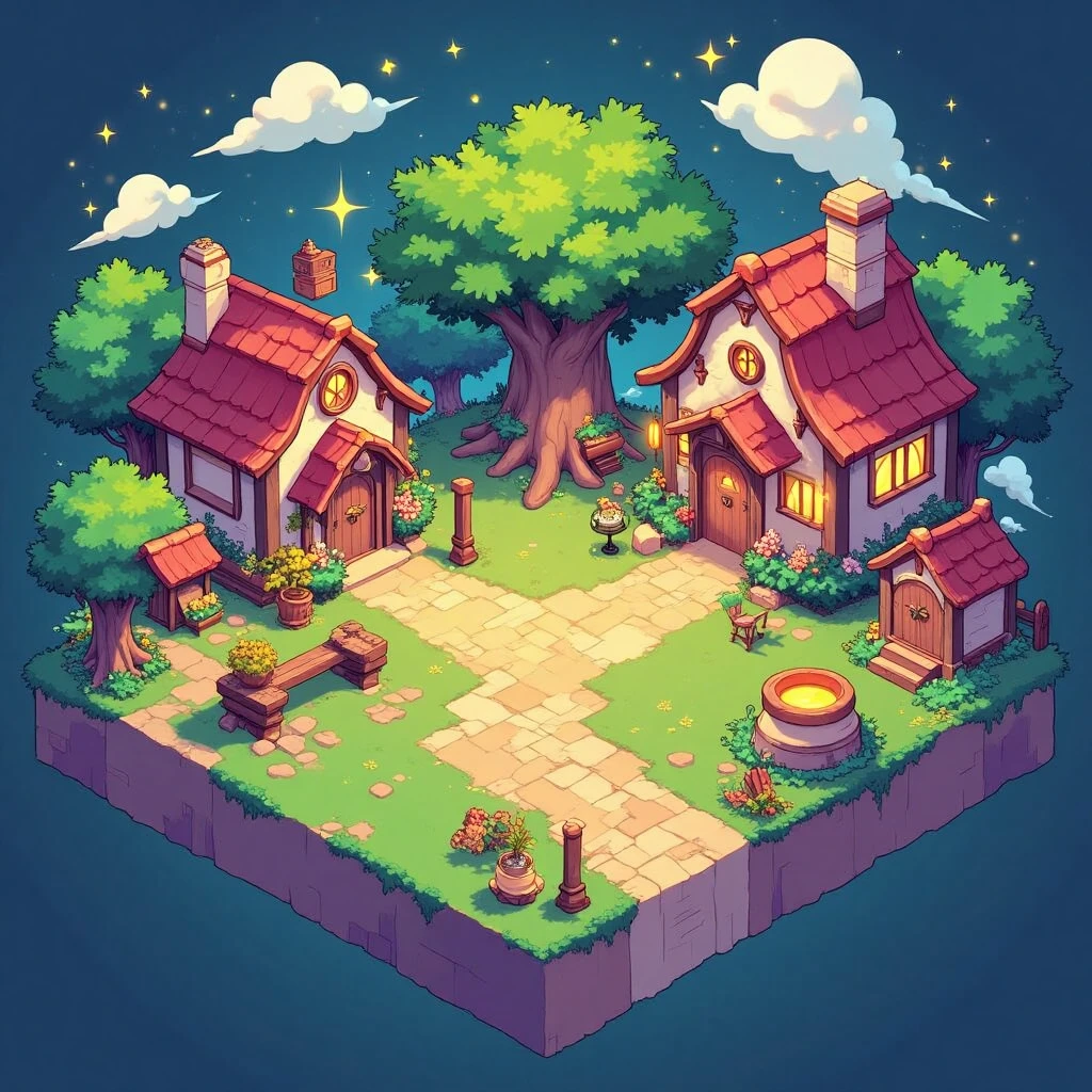 Isometric game scene designs, vibrant forest village, cottages, winding paths, glowing fireflies, misty trees, pastel tones, whimsical charm.