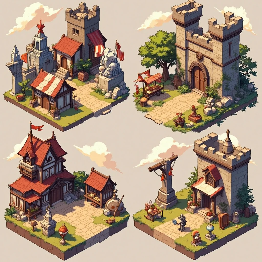 Isometric game scene designs, medieval castle town, stone walls, market stalls, knight statues, earthy browns, historic charm.
