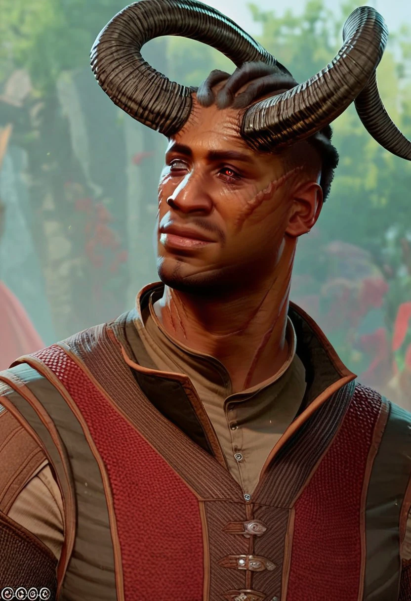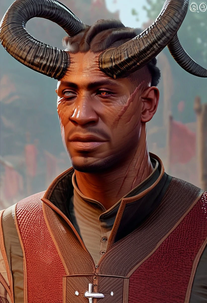 Prompts Used: wyllbg3, cornrows, dark skin, scars, red and black outfit, beard, horns, long horns, black horns, white left eye, red right eye with black sclera