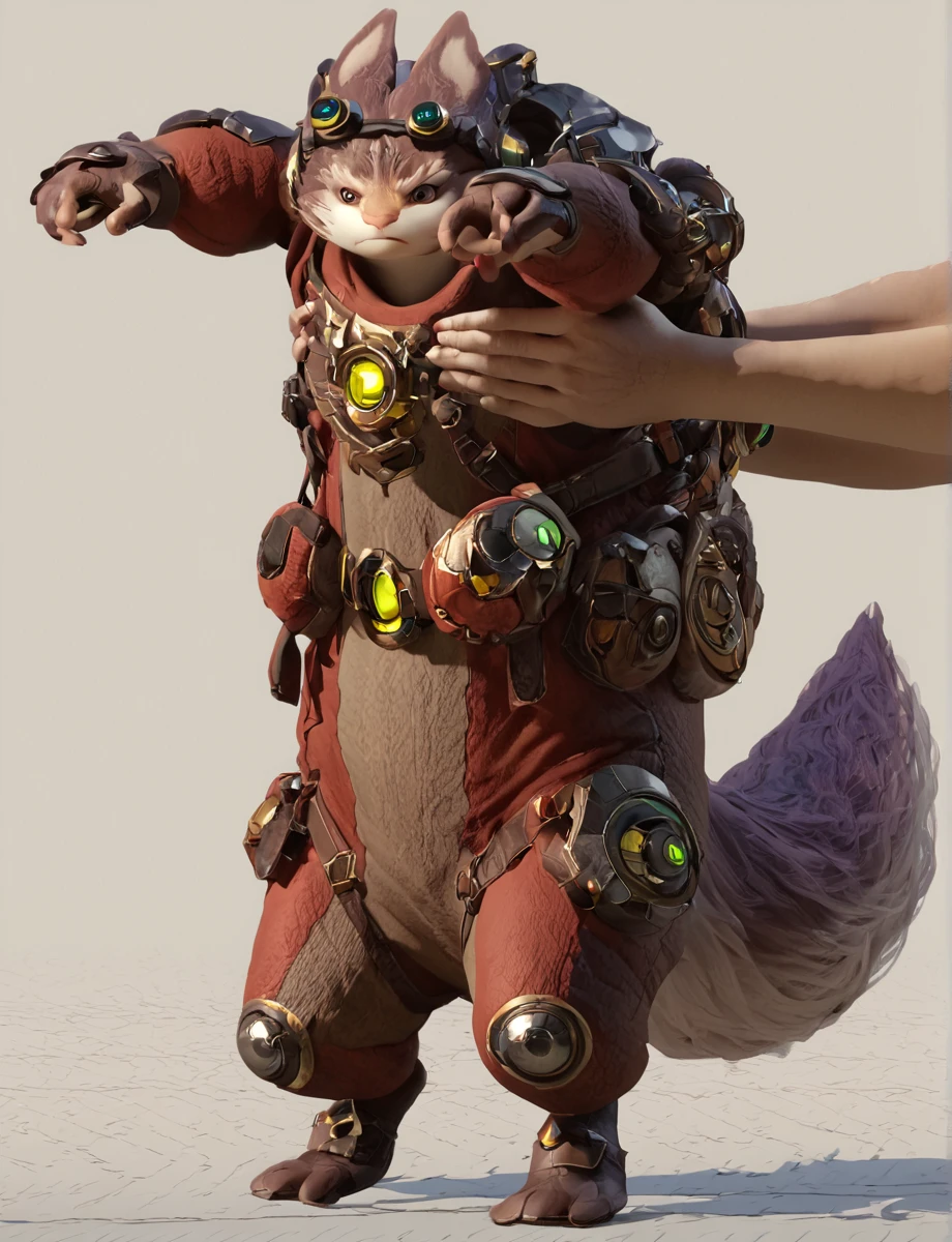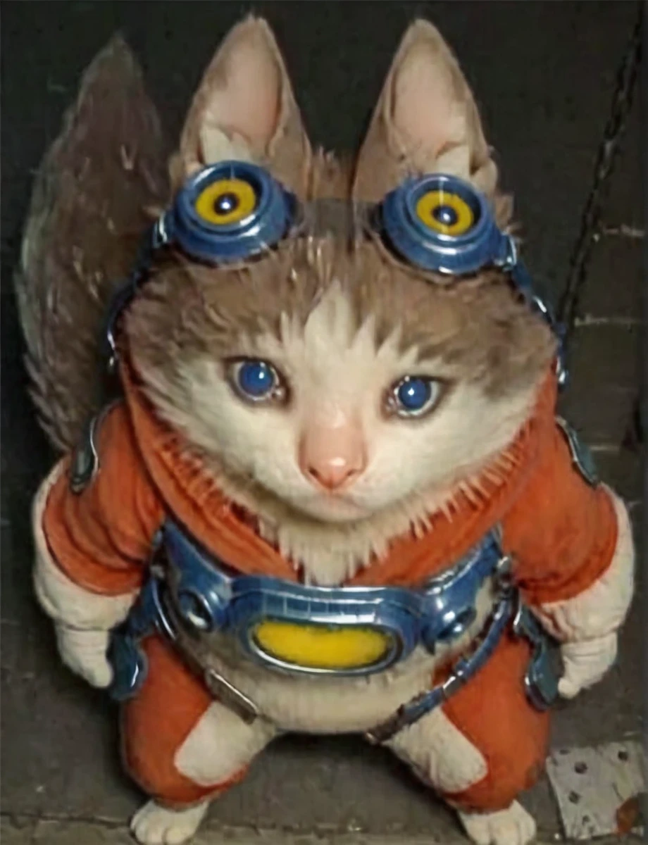 tosca, green eyes, yellow sclera, animal ears, googles on head, wearing tech backpack, frown expression, multi ears,