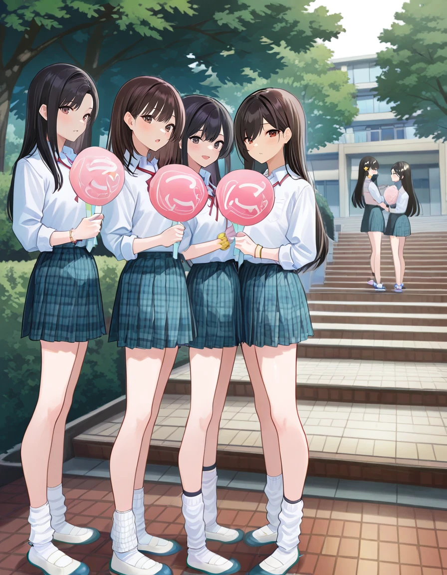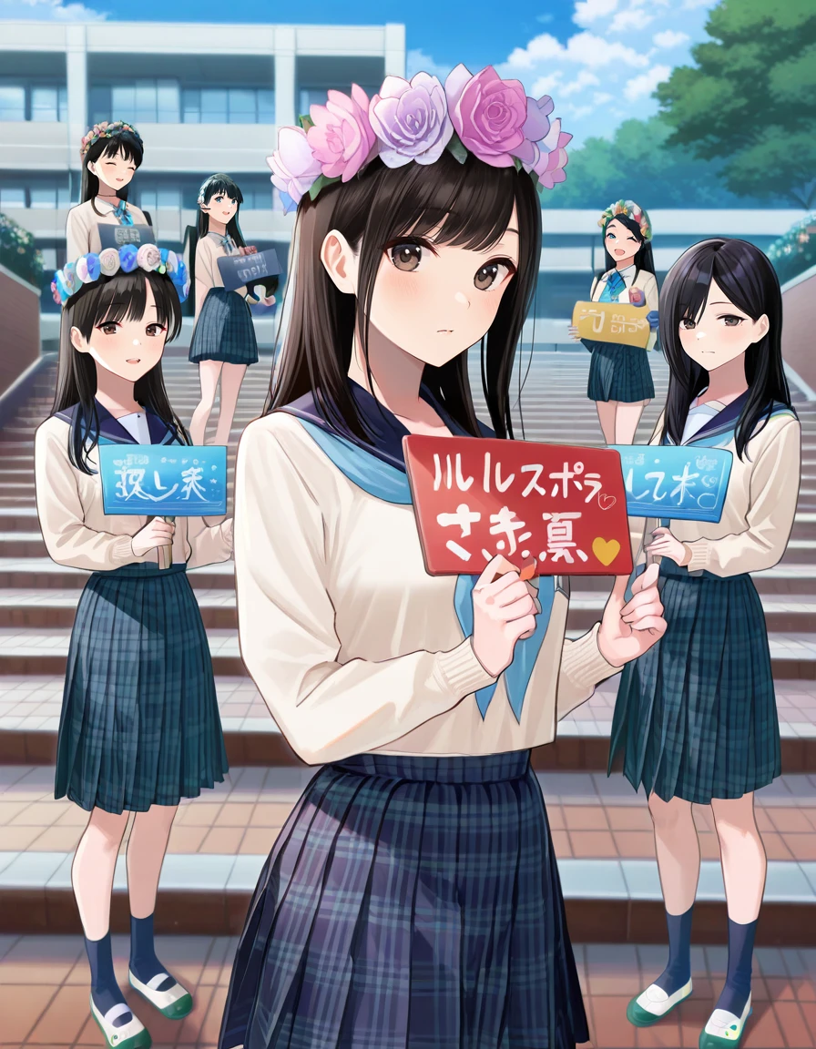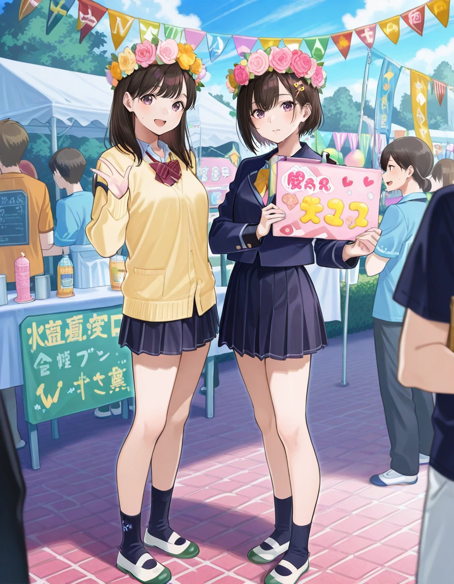 multiple girls, multiple boys, 6+boys, 6+girls, people, sign, balloon, easel, poster (object), canvas (object), string of flags, banner, decoration fans, signboard, head wreath, placard,