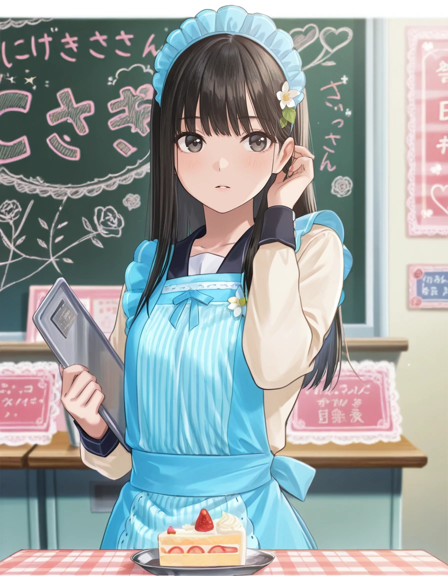 indoors, scenery, school, stairs, locker, classroom, kissaten, chalkboard, flower decoration, tablecloths, stage, audience, sign, poster (object), window, table, chair, wooden floor, desk, clock, paper, book, box, ceiling, pencil, lamp, shop, curtains, sunlight, day, food stall, booth, food stand,