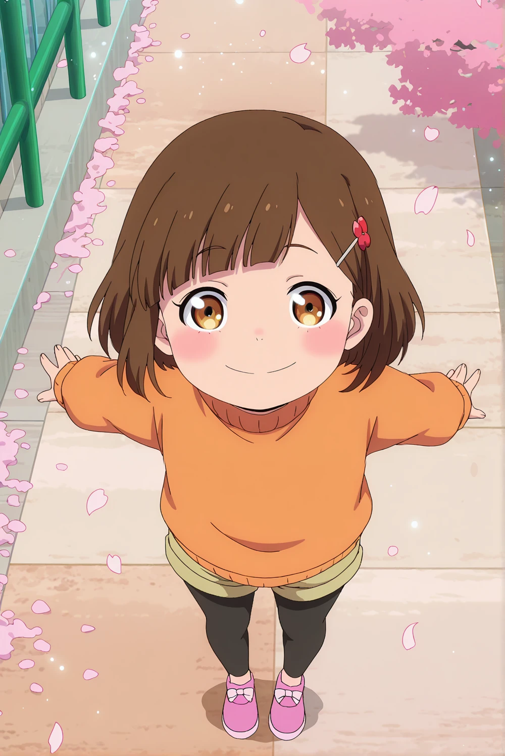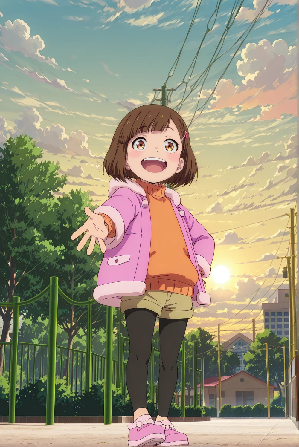 Outfit: miri, def, 1girl, child, brown eyes, brown hair, short hair, hairclip, orange sweater, pink jacket, shorts, leggings, shoes