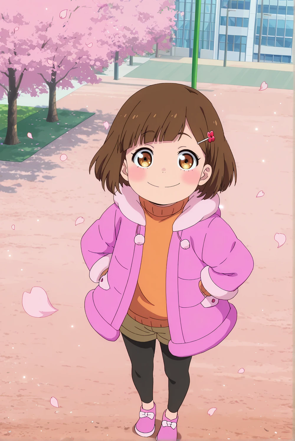 miri, def, 1girl, child, brown eyes, brown hair, short hair, hairclip, orange sweater, pink jacket, shorts, leggings, shoes