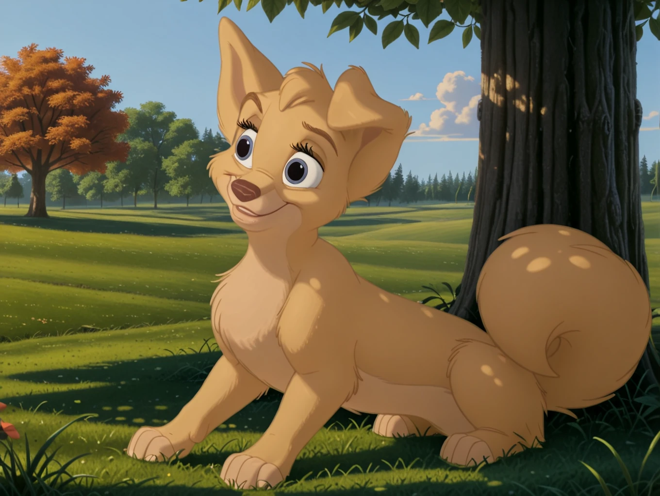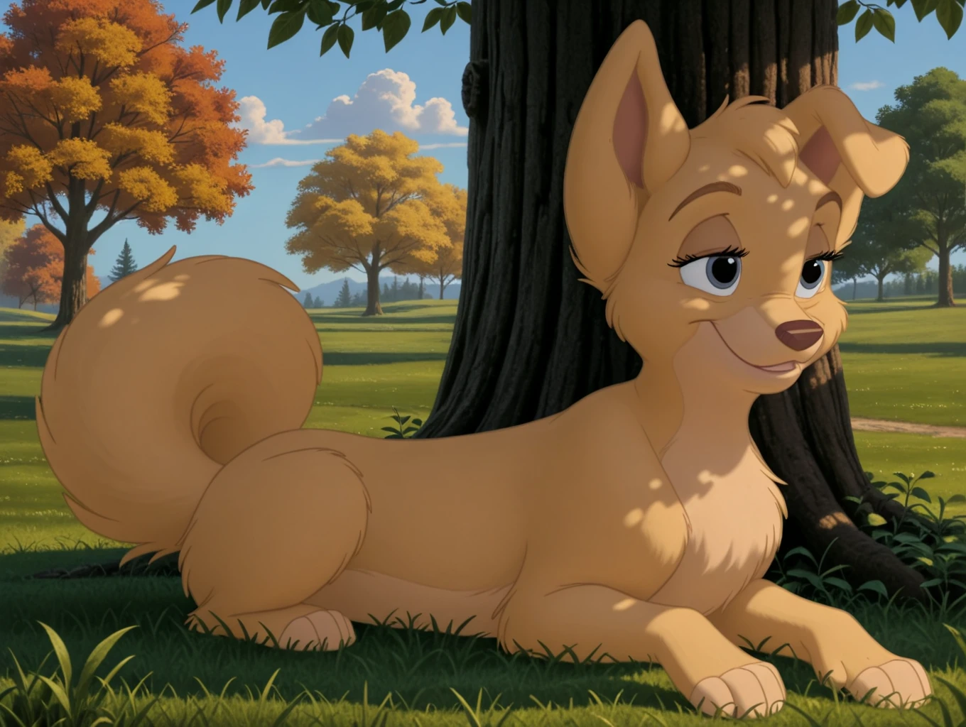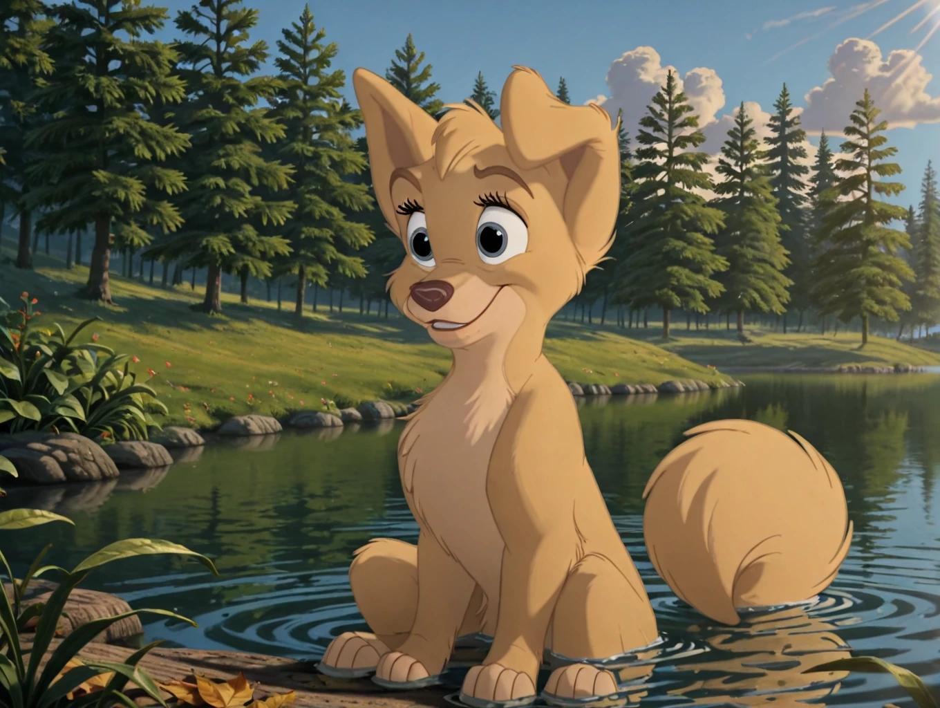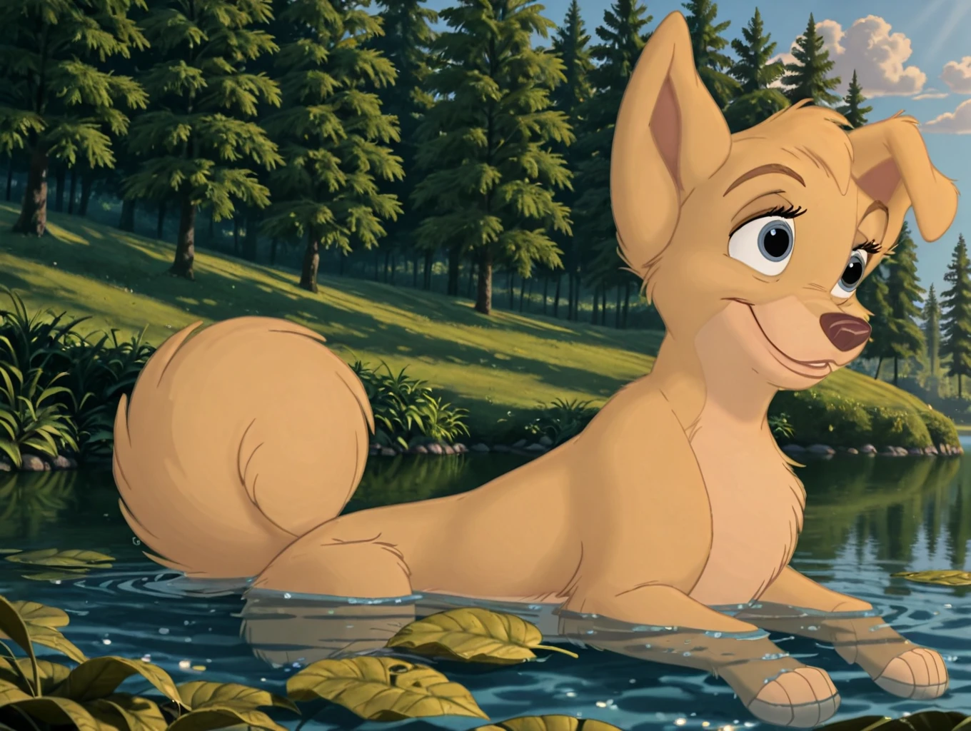 angel, 1dog, dog, puppy, pup, disney, yellow fur, body fur, blue eyes, feral, female, folded left ear,