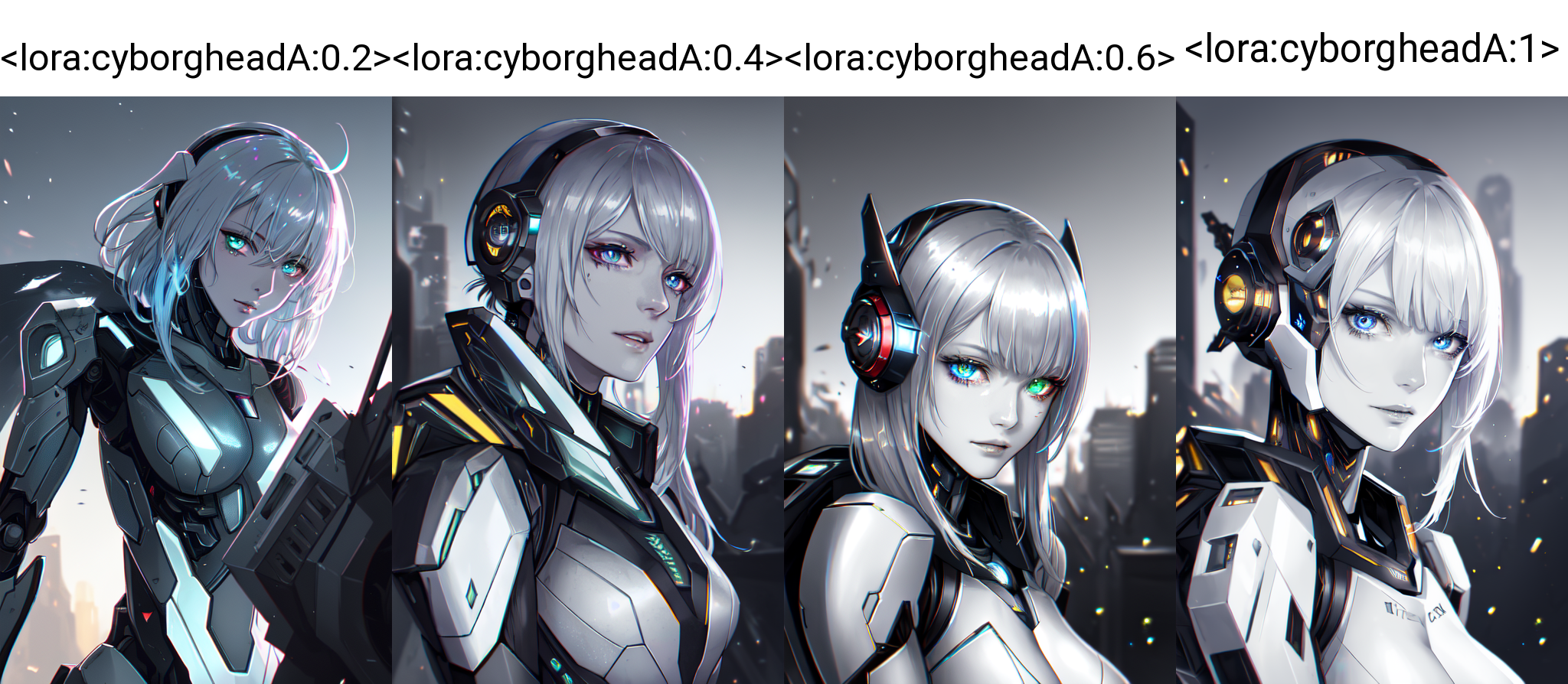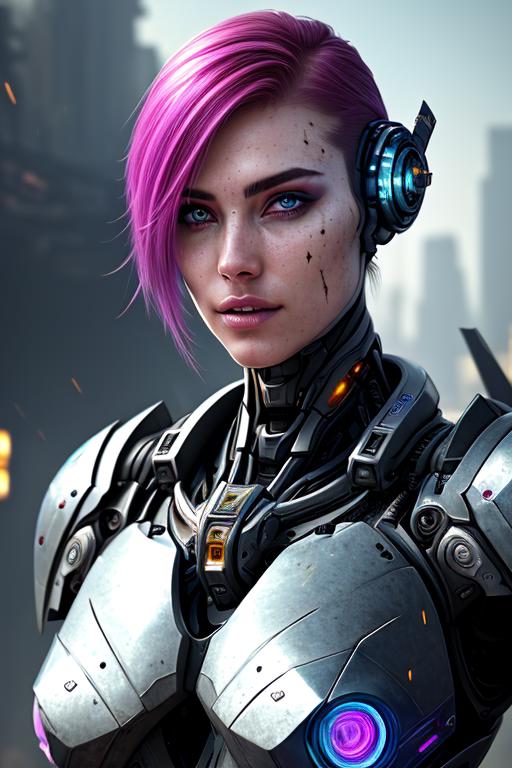This LoRA adds a cybernetic look to your character. The higher the LoRA weight, the less human elements will remain. Should work with most SD1.5 models. Using the word 'cyborg' sometimes helps as well in the positive prompt.