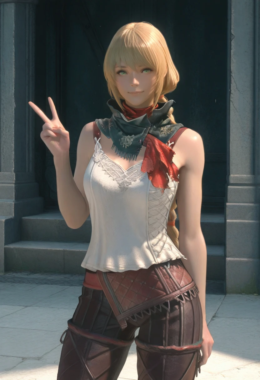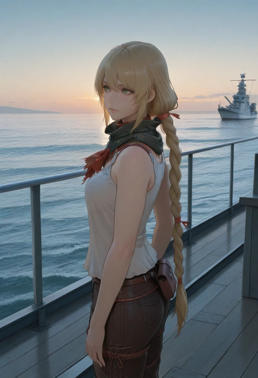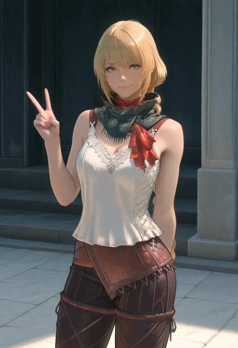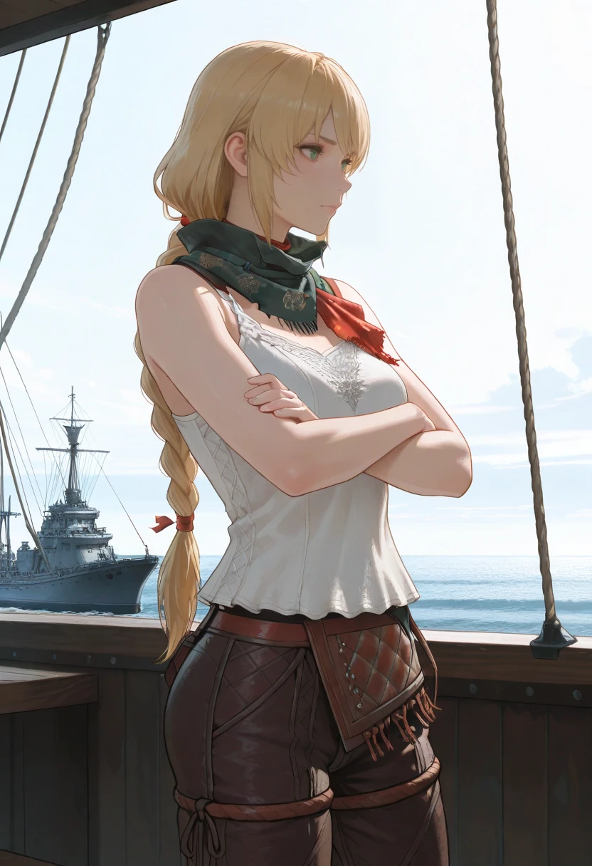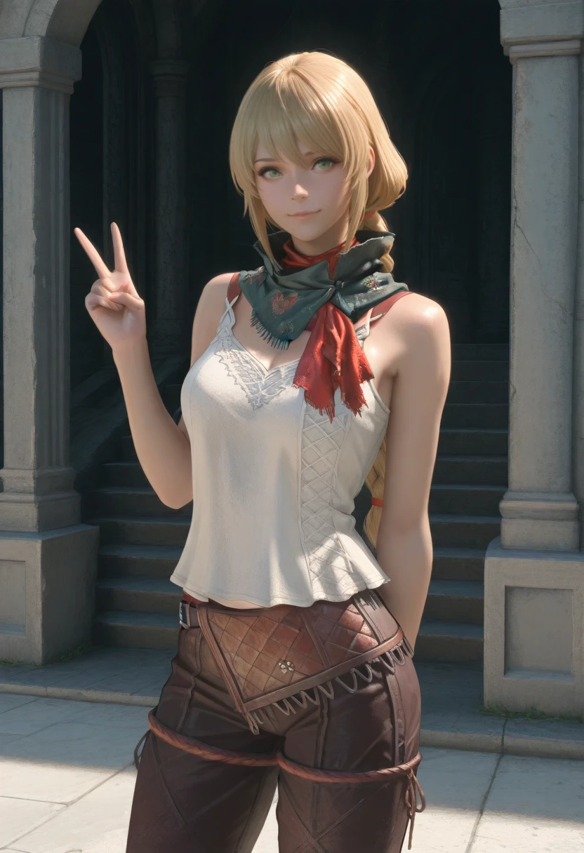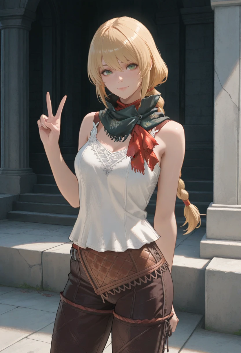 blonde hair, long single braid, scarf, lacy white tank top, brown pants, green eyes,
