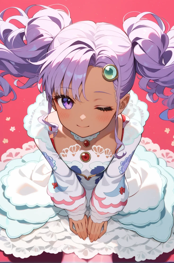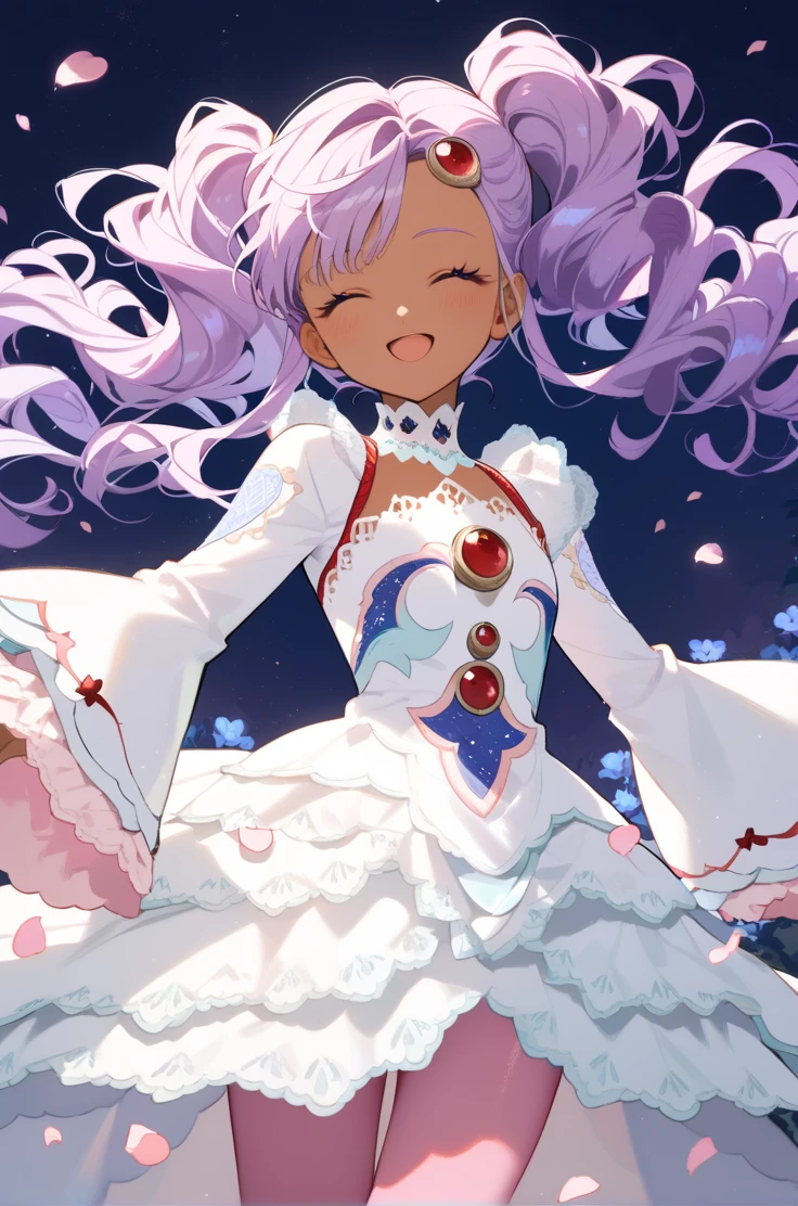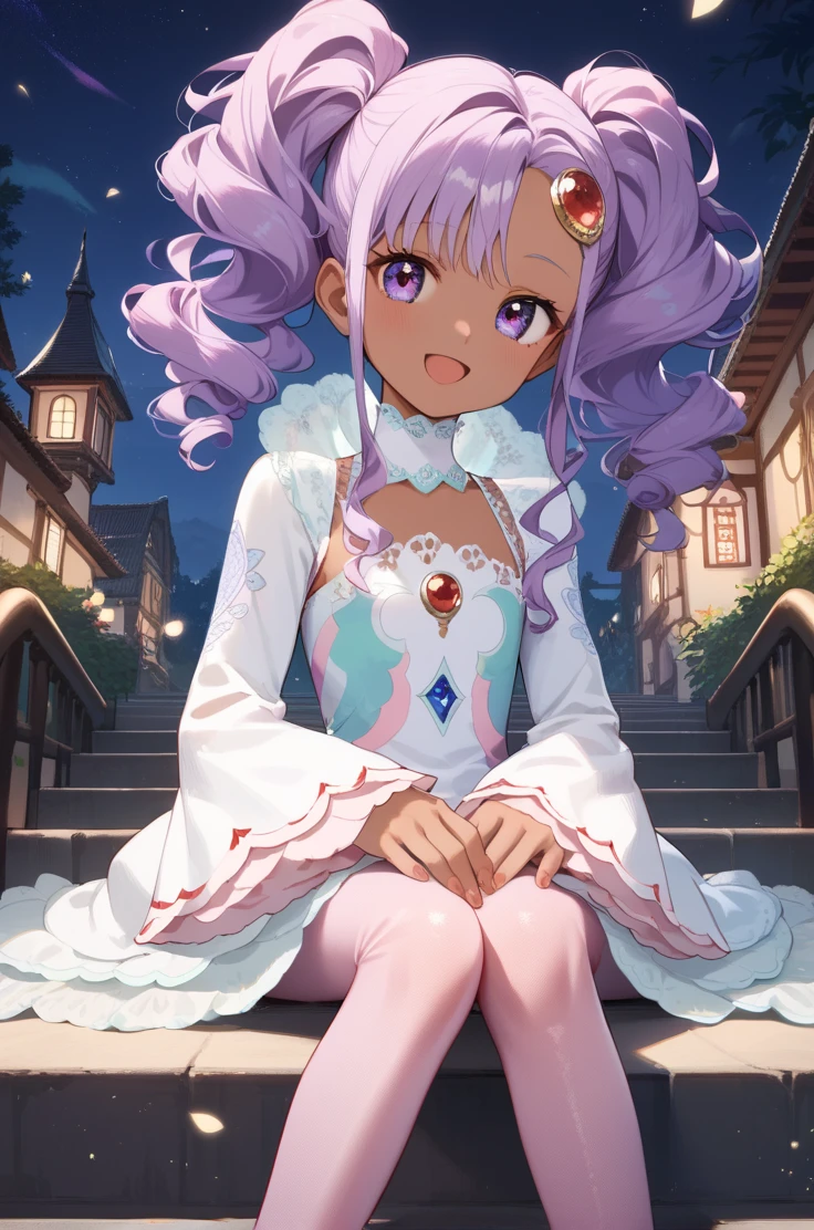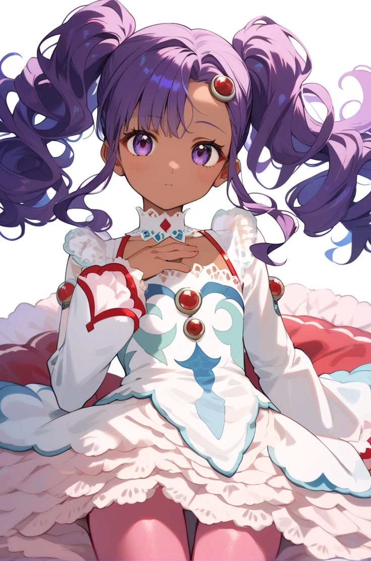 meredyceles, purple hair, twintails, purple eyes, dark skin, wavy hair, sidelocks, long hair, white dress, long sleeves, pink pantyhose, (wide sleeves:0.5), layered dress,