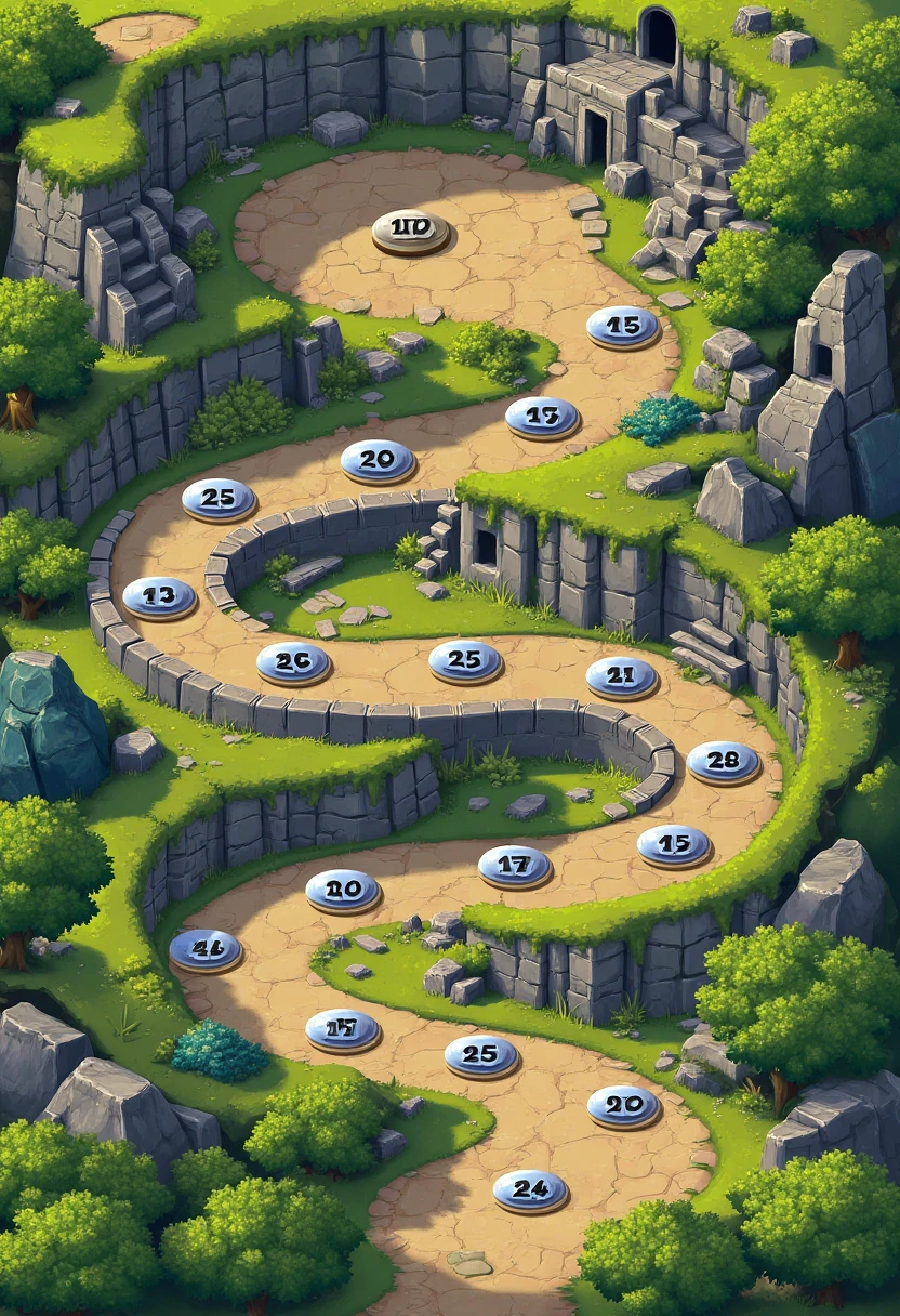 Level - based game map designs, ancient ruins style, stone paths, greenery, mysterious atmosphere, numbered levels.
