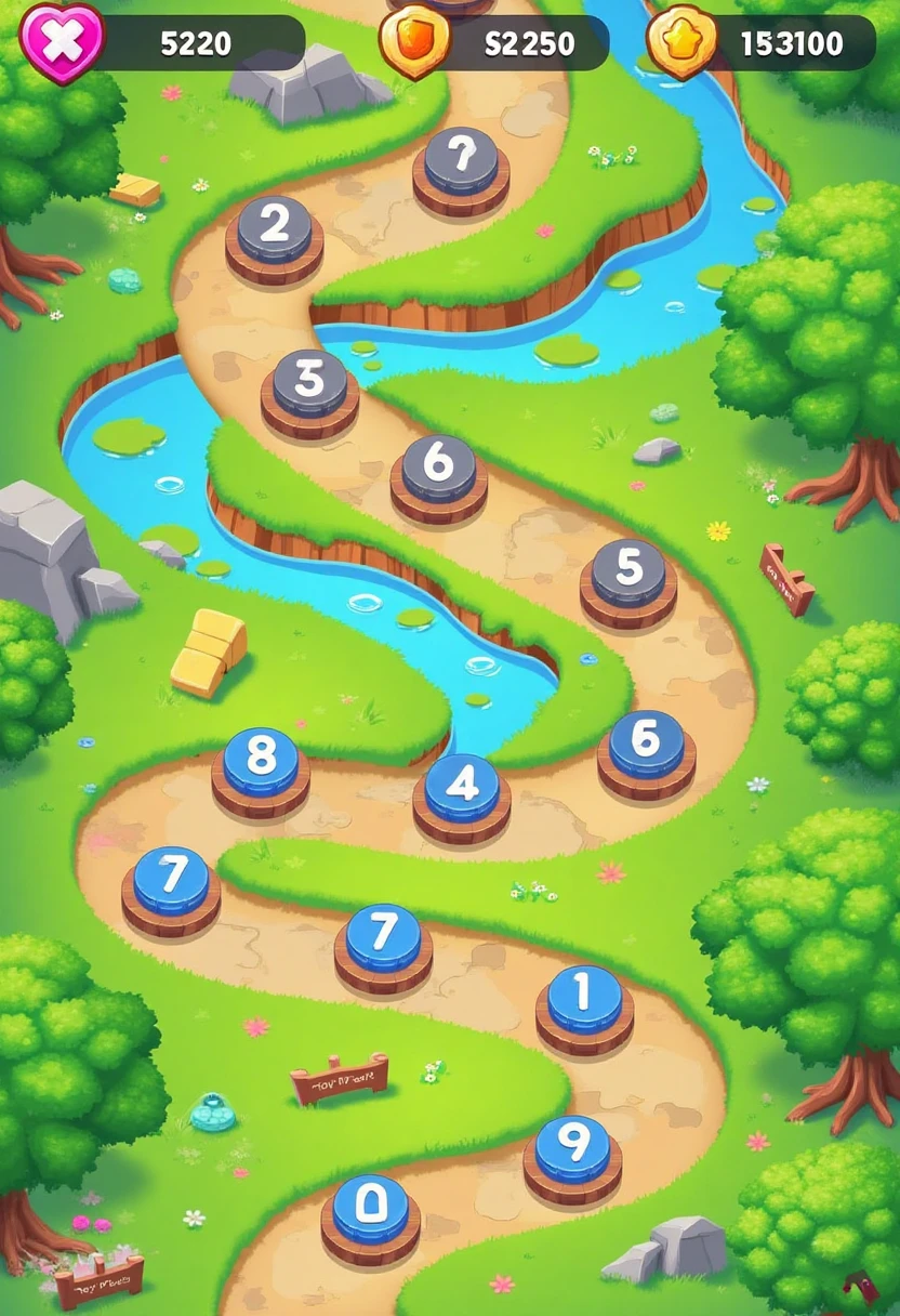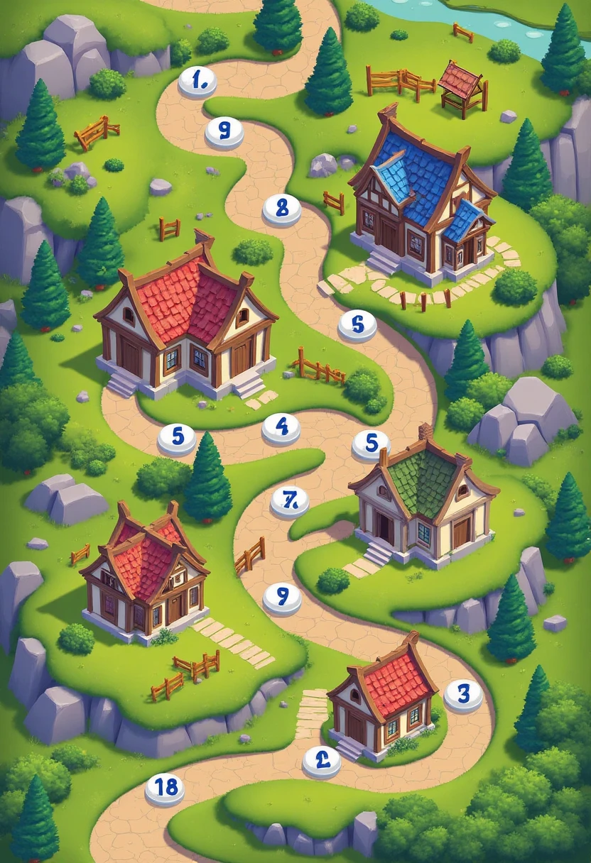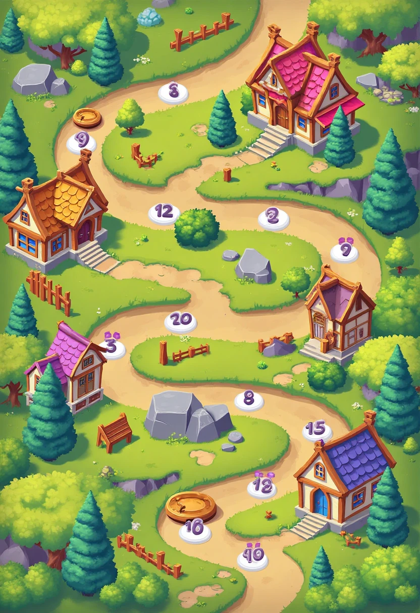 Level - based game map designs, vibrant colors, winding paths, cute buildings, like a whimsical forest adventure, with numbered checkpoints.