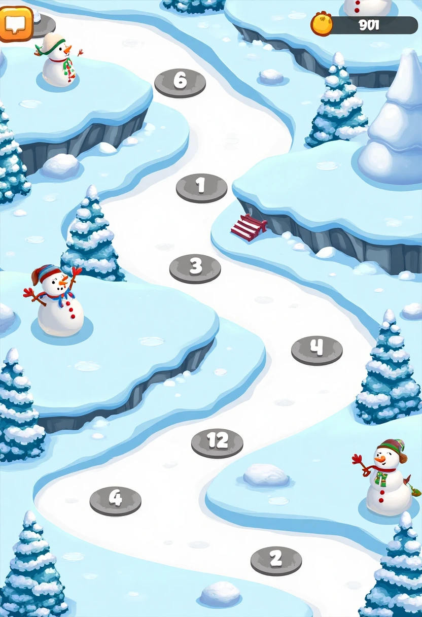Level - based game map designs, snowy land, white paths, icy levels, cute snowmen, level numbers.