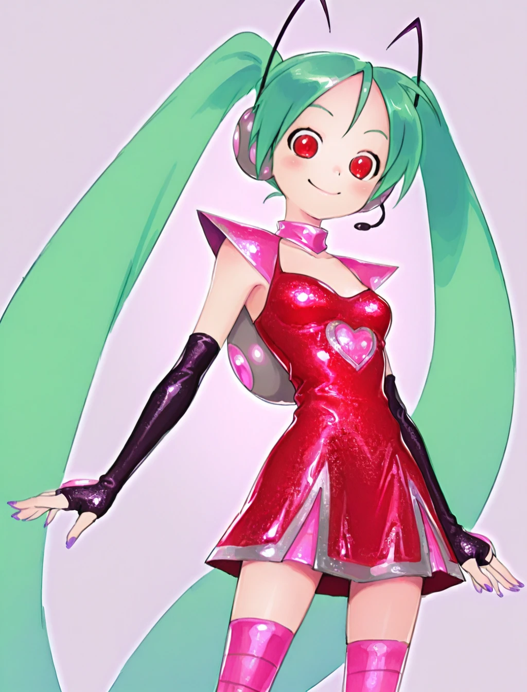 headphones, short sleeves, antennae, pink sleeves, collar, red dress, short dress, elbow gloves, black gloves, fingerless gloves, backpack, pink socks, black boots, purple nails