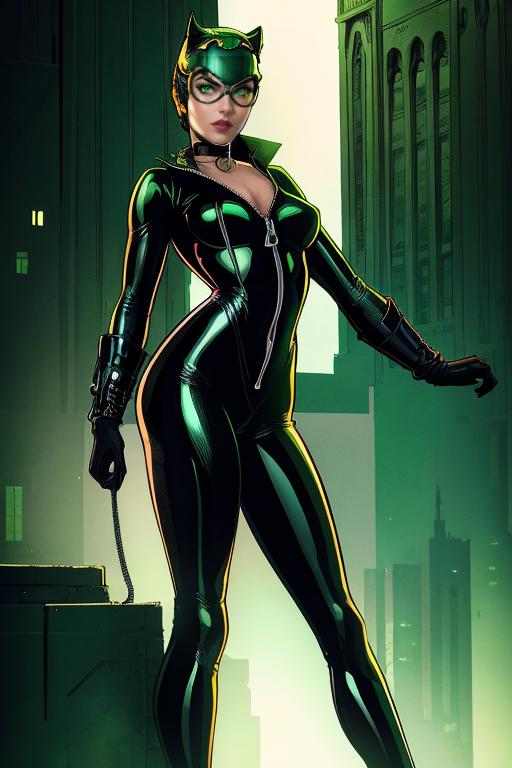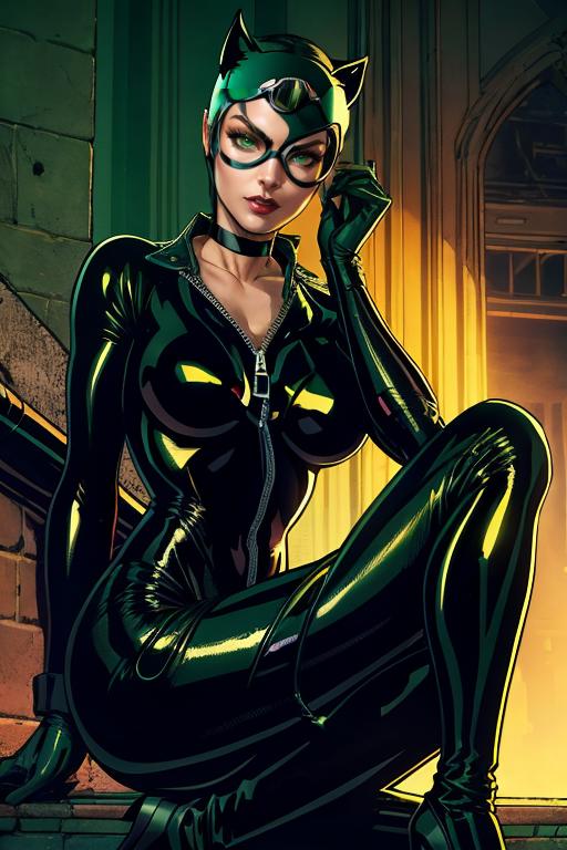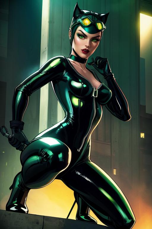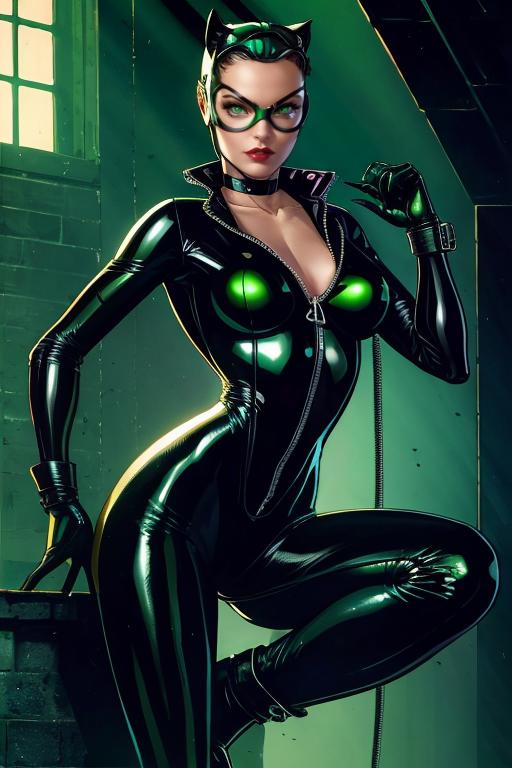 catwoman, bodysuit, goggles on head, gloves, choker, unzipped, green eyes