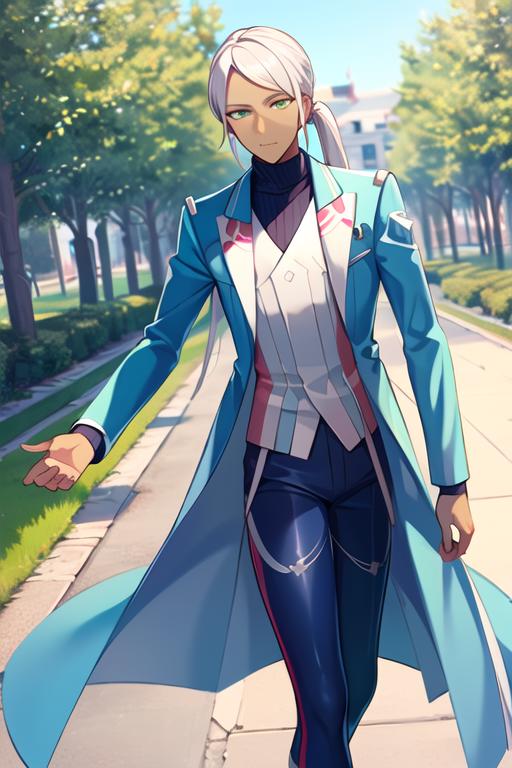 blanche_pgo, long hair, ponytail, white hair, green eyes, coat
