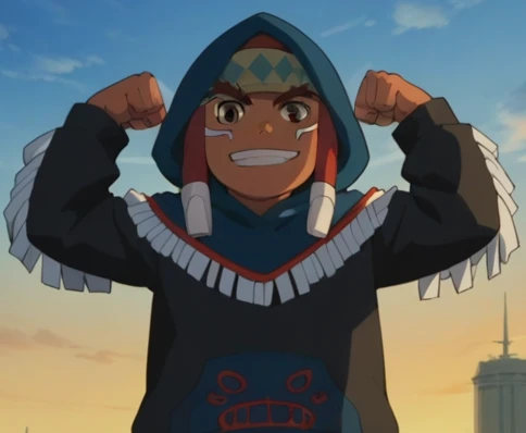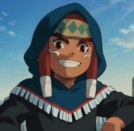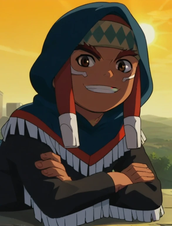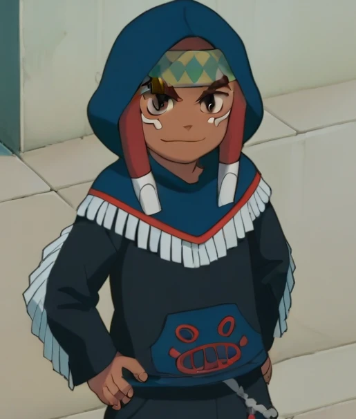 Prompts: male, dark skin, red hair, hair tubes, headband, brown eyes, thick eyebrows, facepaint, hood (down), poncho, fringe trim, long sleeves, black shorts, feathers, shoes