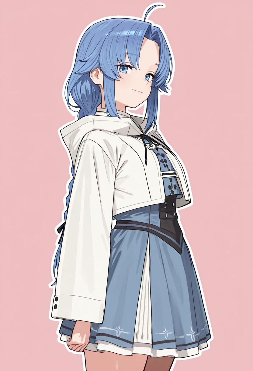 l4r4gr31r4t, blue eyes, blue hair, ahoge, long hair, parted bangs, single braid, hair ribbon,