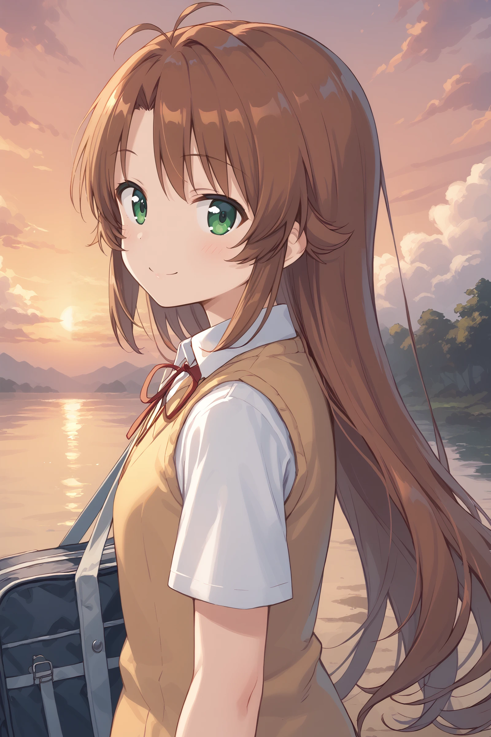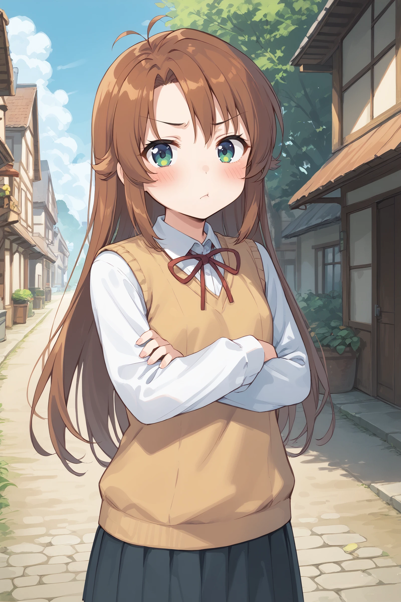 Use shirt, sweater vest, neck ribbon, skirt for her standart outfit.