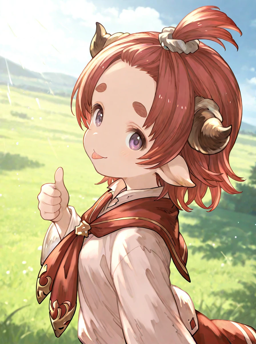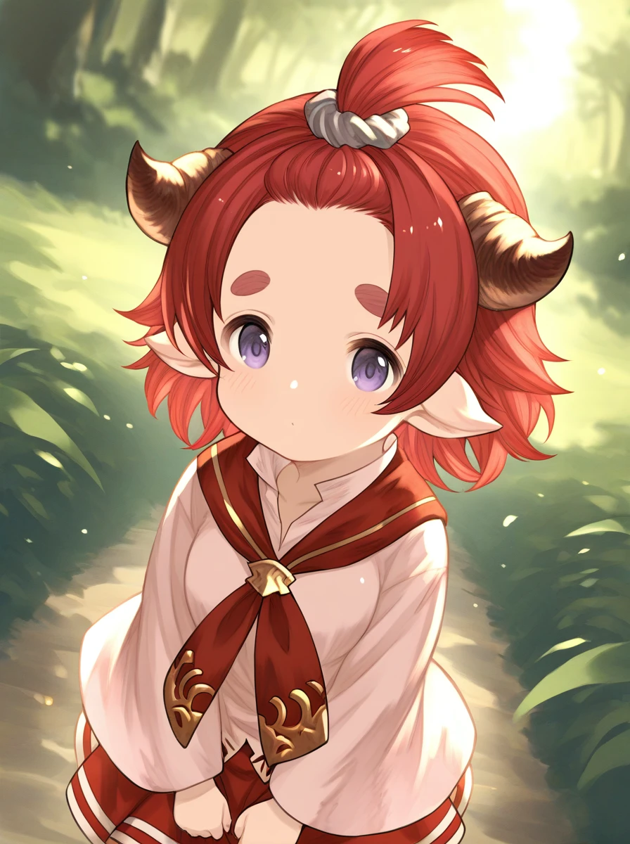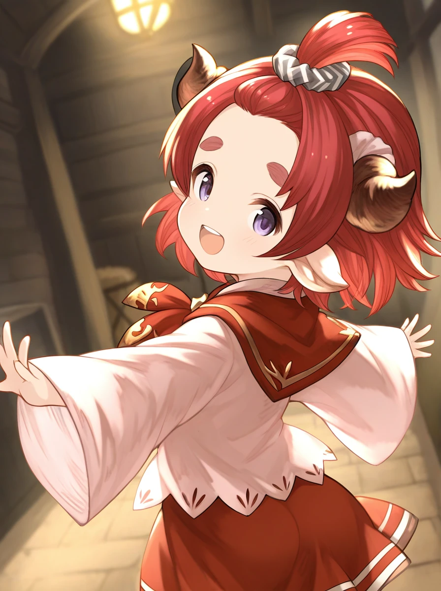 <lora:ardora_gbf_illustrious-10:1>, ardora_gbf, ardora (granblue fantasy), draph, horns, curled horns, pointy ears, thick eyebrows, animal ears, forehead, short eyebrows, cow girl, ponytail, high ponytail, short ponytail, eyebrows, brown hair, short hair, red hair, topknot, bangs pinned back, bangs, hair ornament, scrunchie, hair scrunchie, grey scrunchie, red scrunchie, purple eyes, neckerchief, red neckerchief, red neckwear, shirt, white shirt, wide sleeves, long sleeves, dress, skirt, red skirt, red dress, brown footwear, fur trim, fur-trimmed boots, boots, brown boots