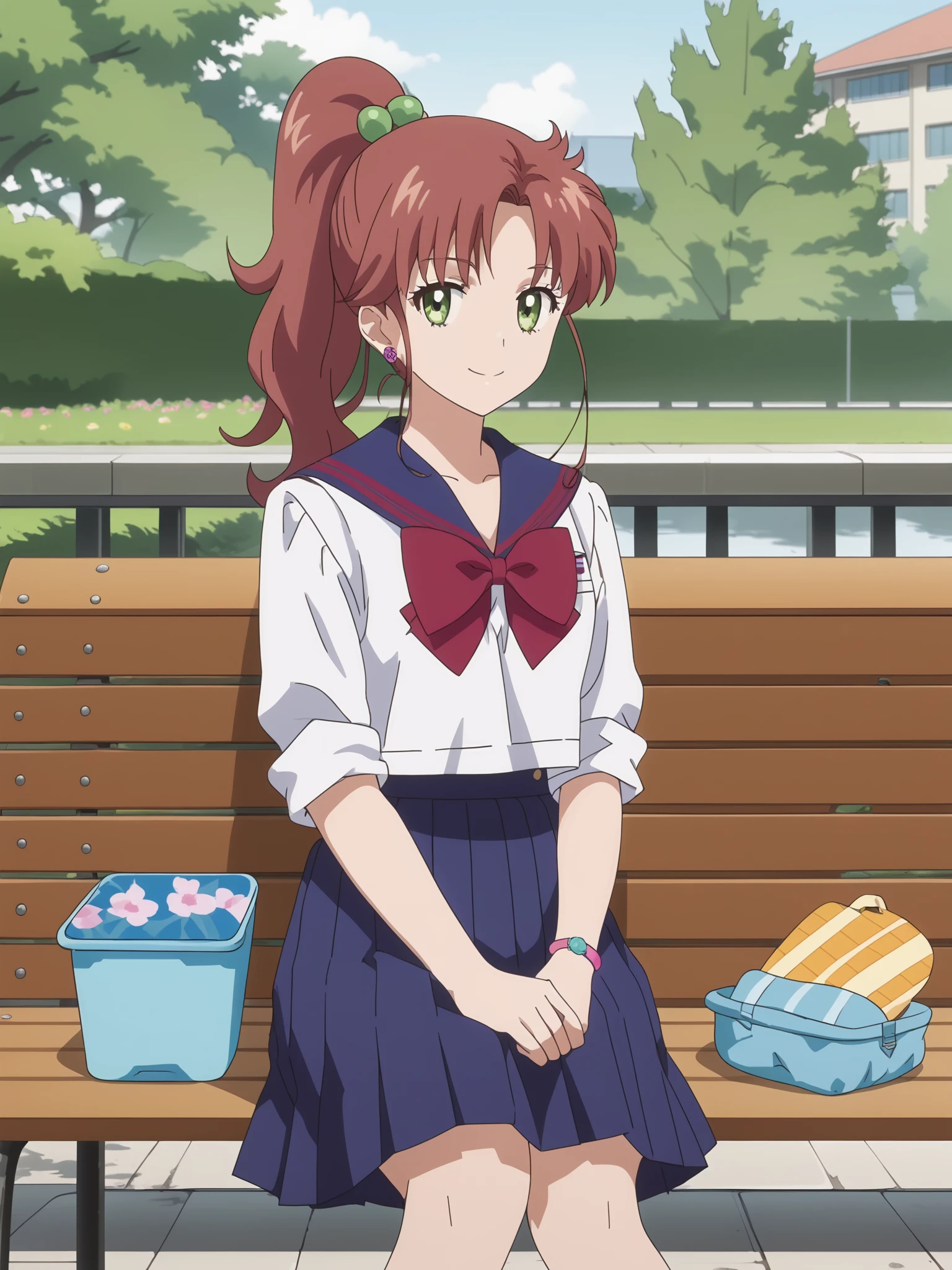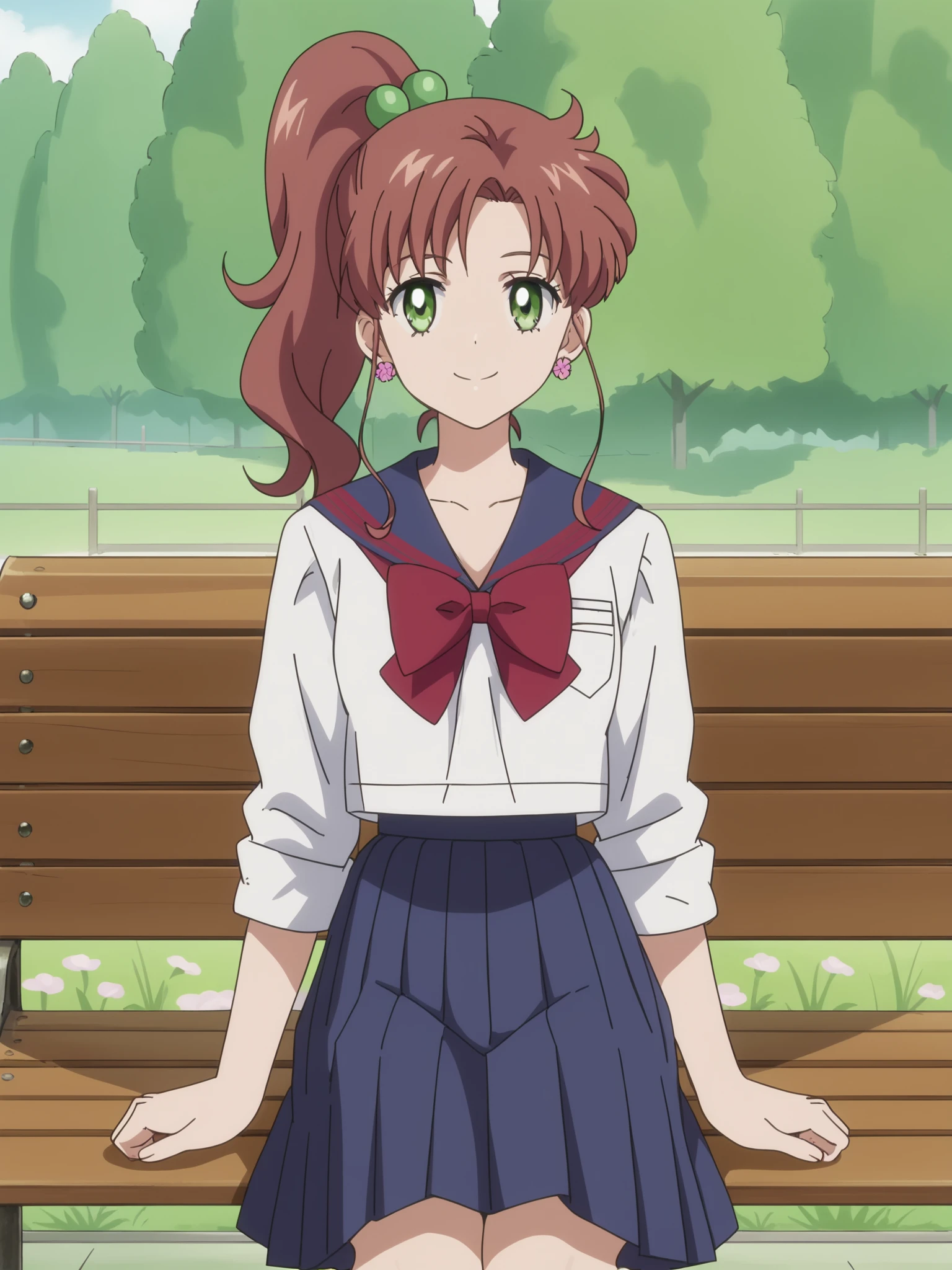 Sailor Jupiter, Brown hair, green eyes, ponytail, flower earrings, School uniform, pleated skirt, serafukiu, sailor collar, bow, earings, hair bobbles | brown skirt, brown sailor collar