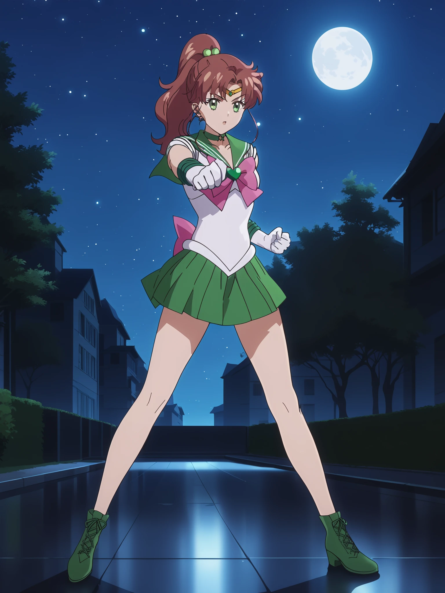 Sailor Jupiter, Brown hair, green eyes, ponytail, flower earrings, Sailor senshi uniform, green sailor collar, green heart brooch, green choker, pink bow, jewelry, gloves,