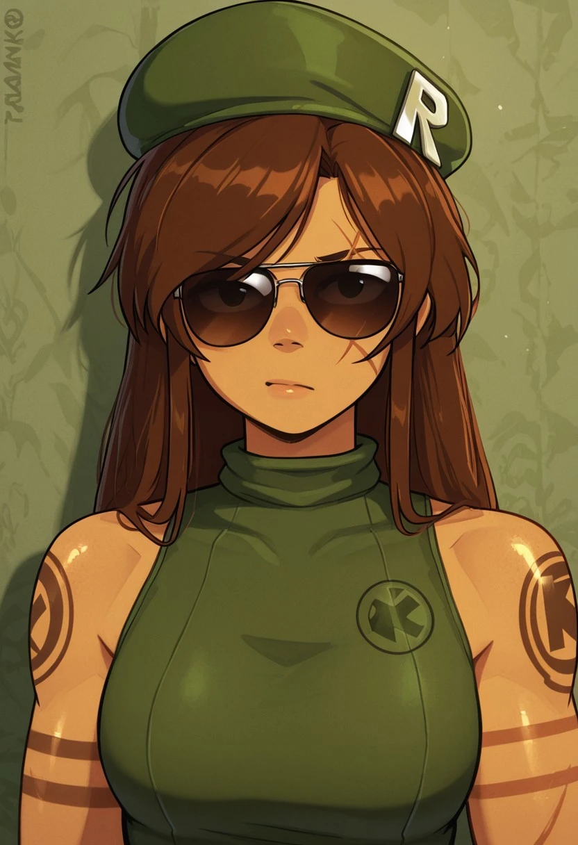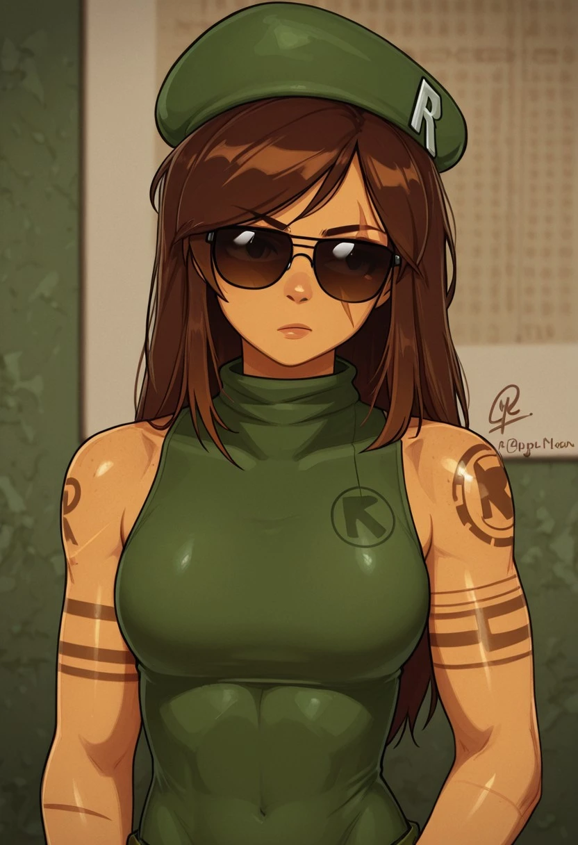 1girl, C4m1, brown hair, beret, sunglasses, tattoo, scar