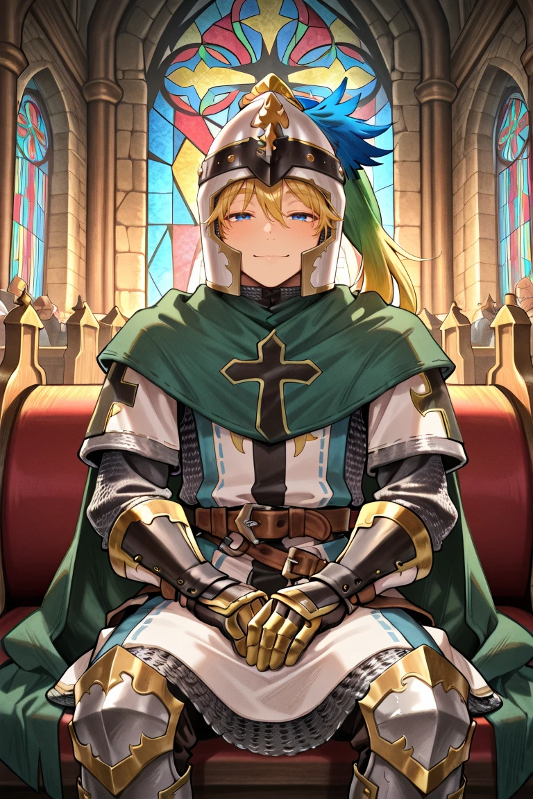 GrdoDef, 1boy, 1man, adult male, blue eyes, blonde eyebrows, helmet, multicolored plume, plume, green plume, armor, chainmail, tunic, white tunic, black cross on shirt, green cape, cape, gauntlets, belt, greaves