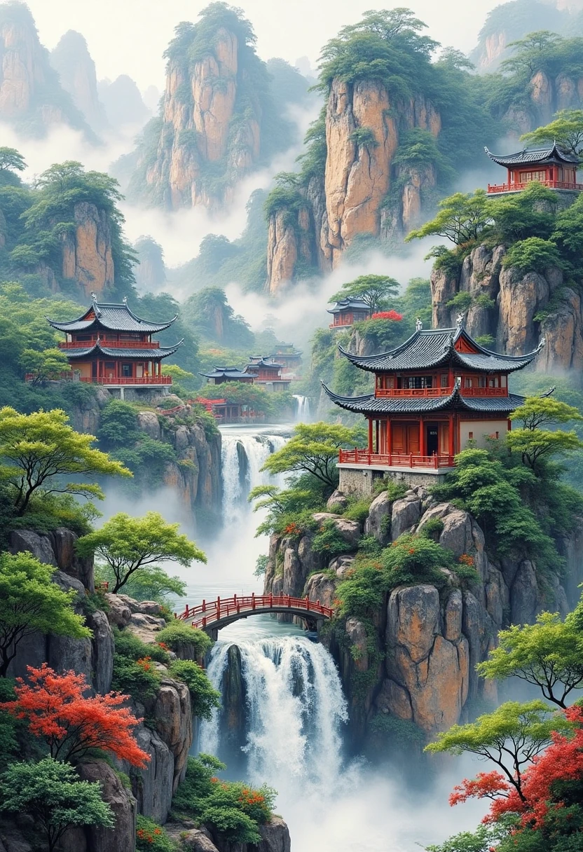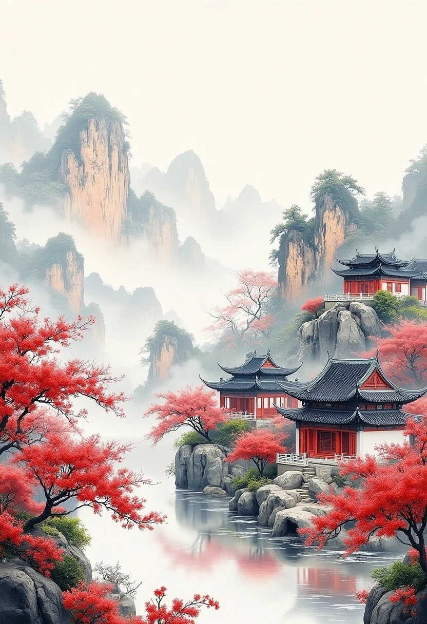 1. Traditional Chinese architectural landscape, ancient temples surrounded by red blossoms, misty mountains in the background, ink - wash painting style, serene and picturesque.