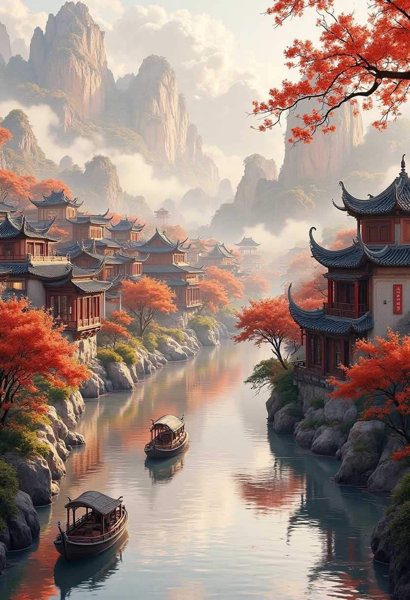 5. Traditional Chinese architectural landscape, riverside town with classic buildings, boats floating, sunset glow, warm and nostalgic atmosphere.