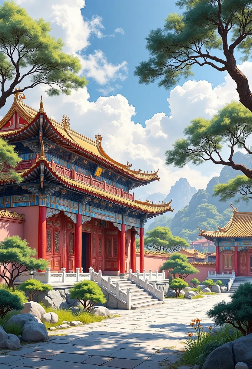 6. Traditional Chinese architectural landscape, imperial - style palaces, red pillars and golden roofs, solemn and magnificent, under a clear blue sky.