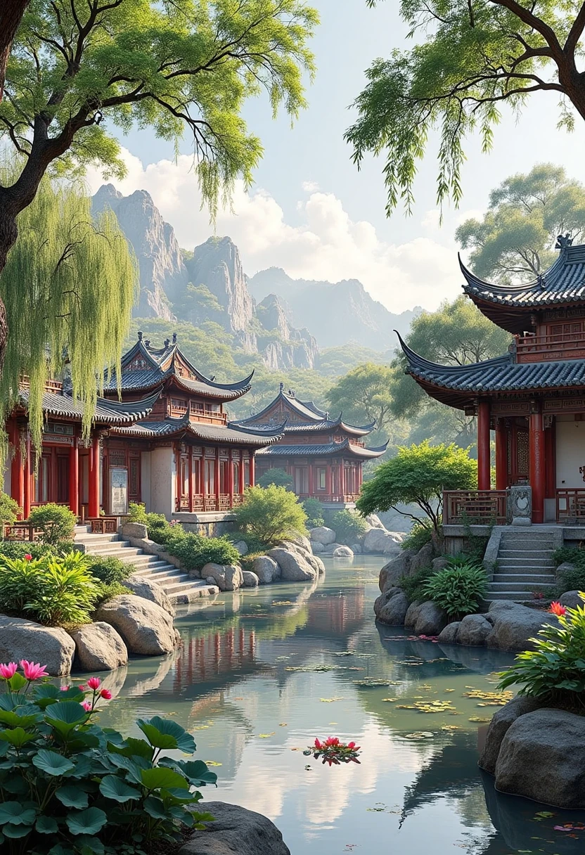 9. Traditional Chinese architectural landscape, garden with winding corridors, lotus ponds, willow trees, elegant and refined, typical of Jiangnan style.