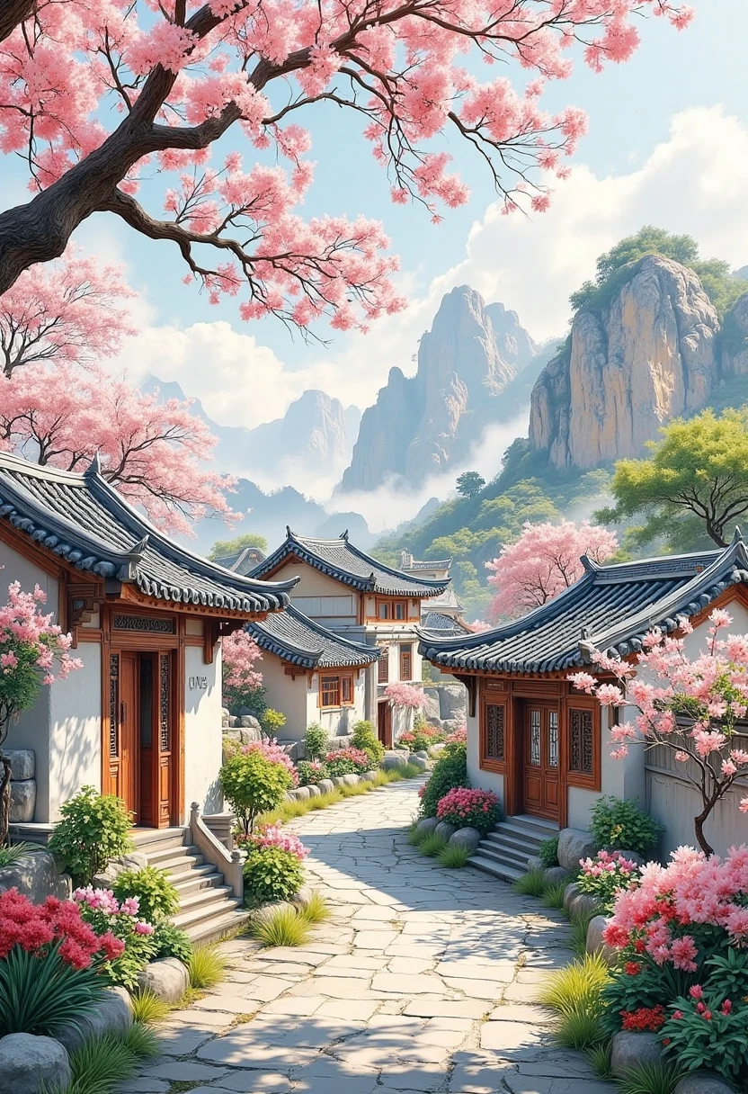 7. Traditional Chinese architectural landscape, rural cottages with tiled roofs, blooming flowers in the yard, gentle breeze, simple and idyllic charm.