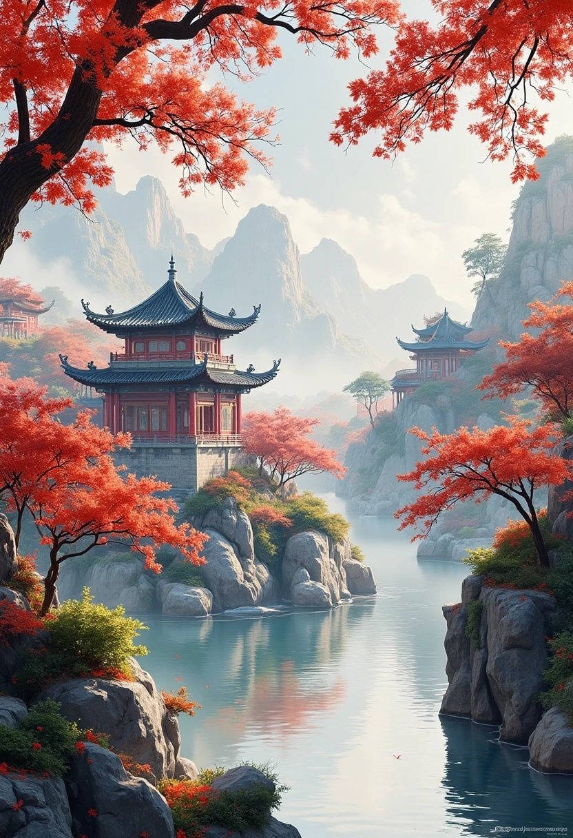 2. Traditional Chinese architectural landscape, pagodas by a flowing river, autumn leaves falling, soft sunlight, creating a tranquil and poetic scene.