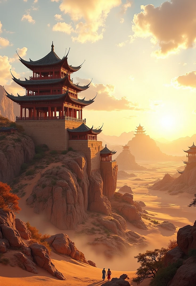 10. Traditional Chinese architectural landscape, desert - edge watchtowers, sand dunes in the distance, a touch of sunset, showing desolate grandeur.