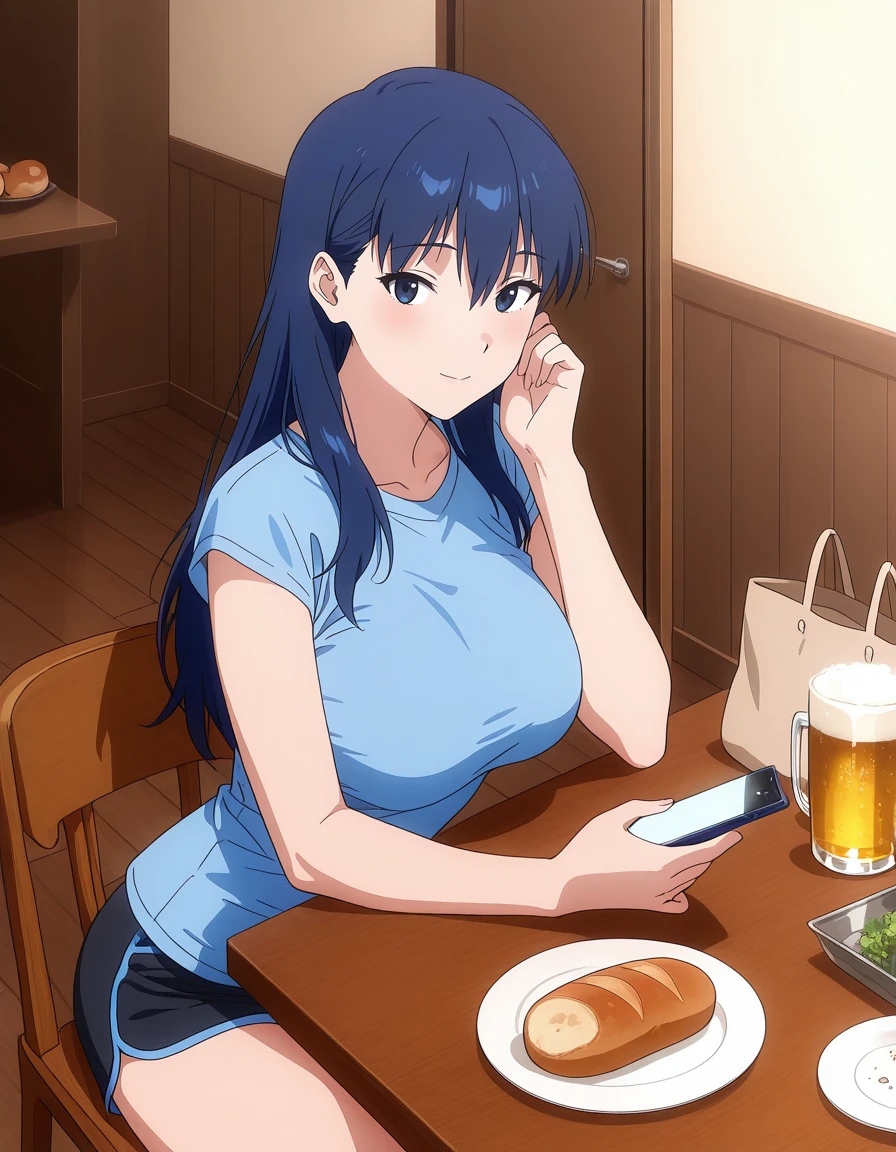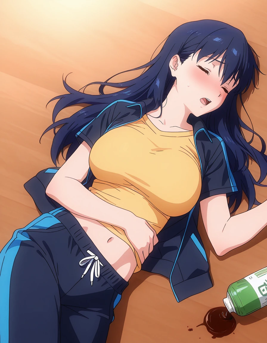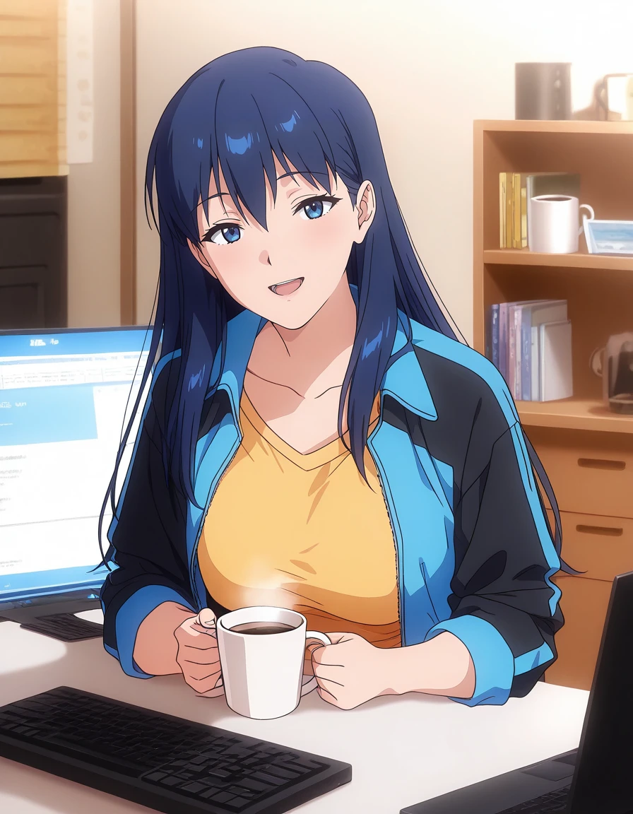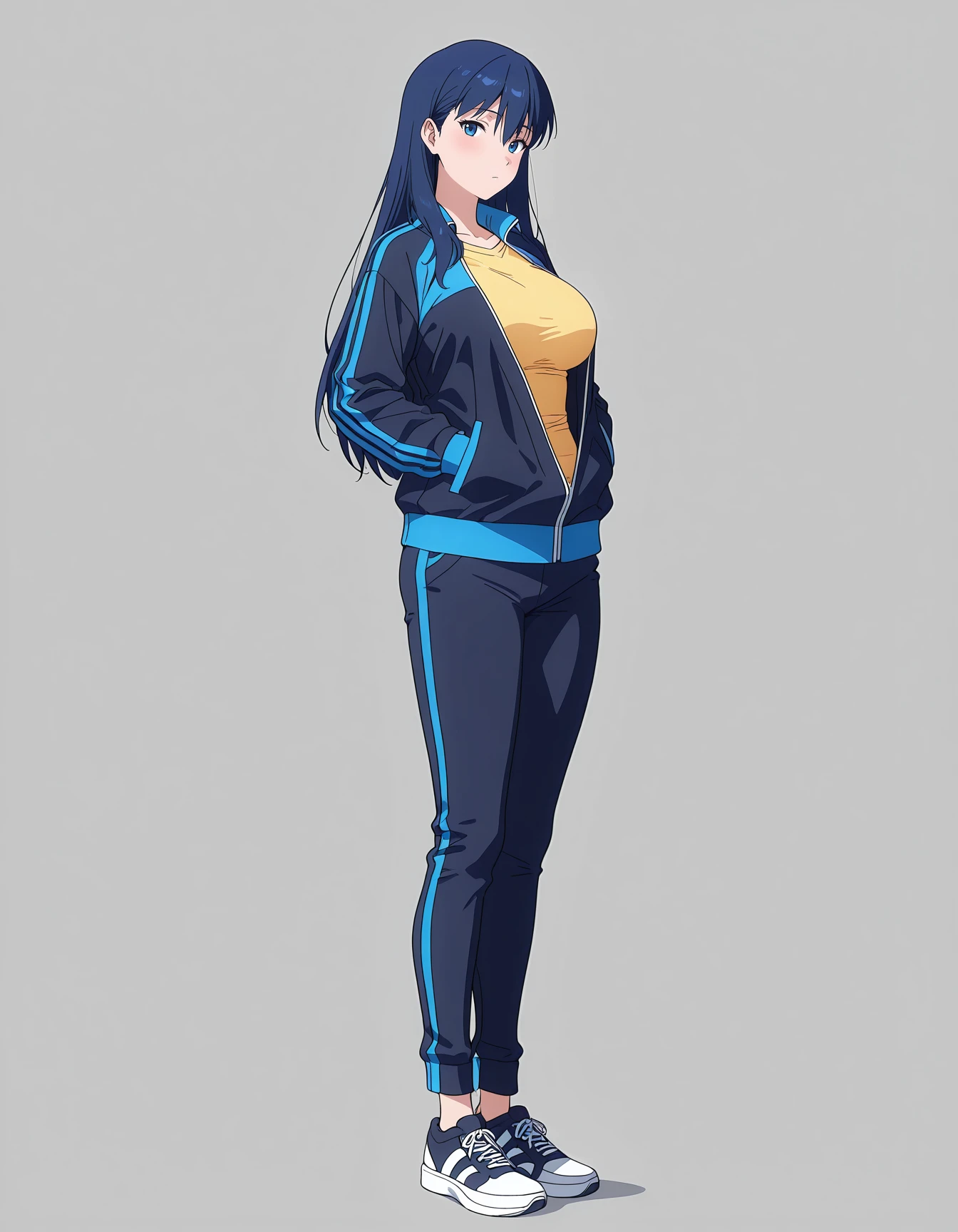 mai_makotontr,long_hair,blue_hair,blue_eyes,track_jacket,yellow_shirt,track_pants,dark_blue_clothes,sneakers