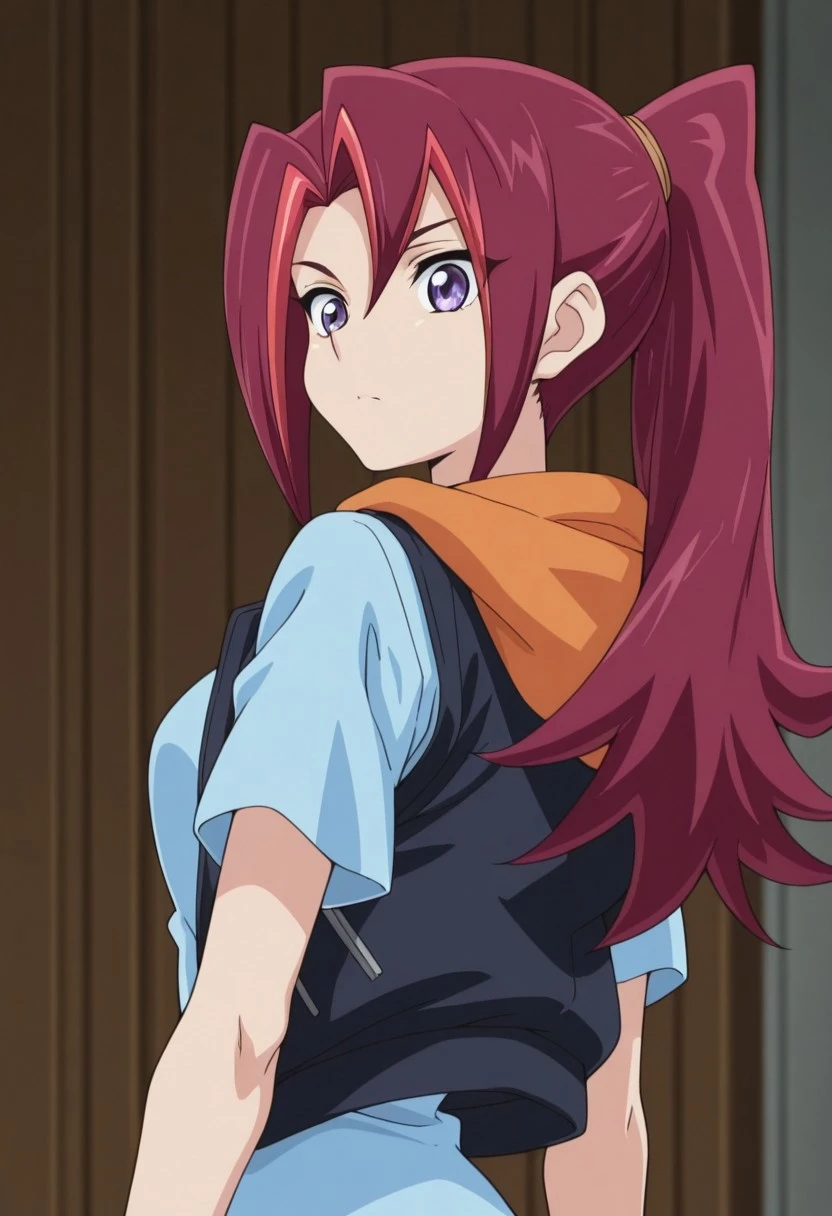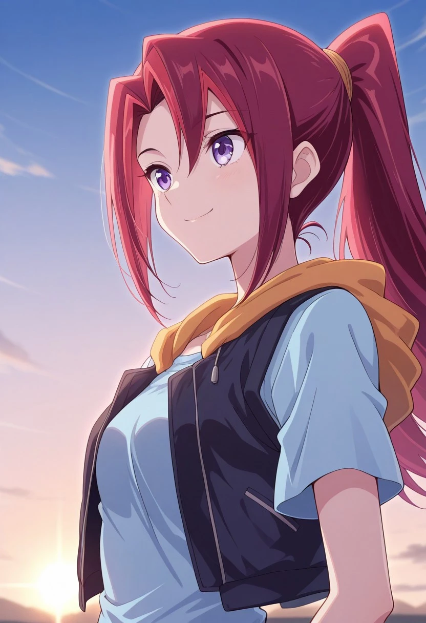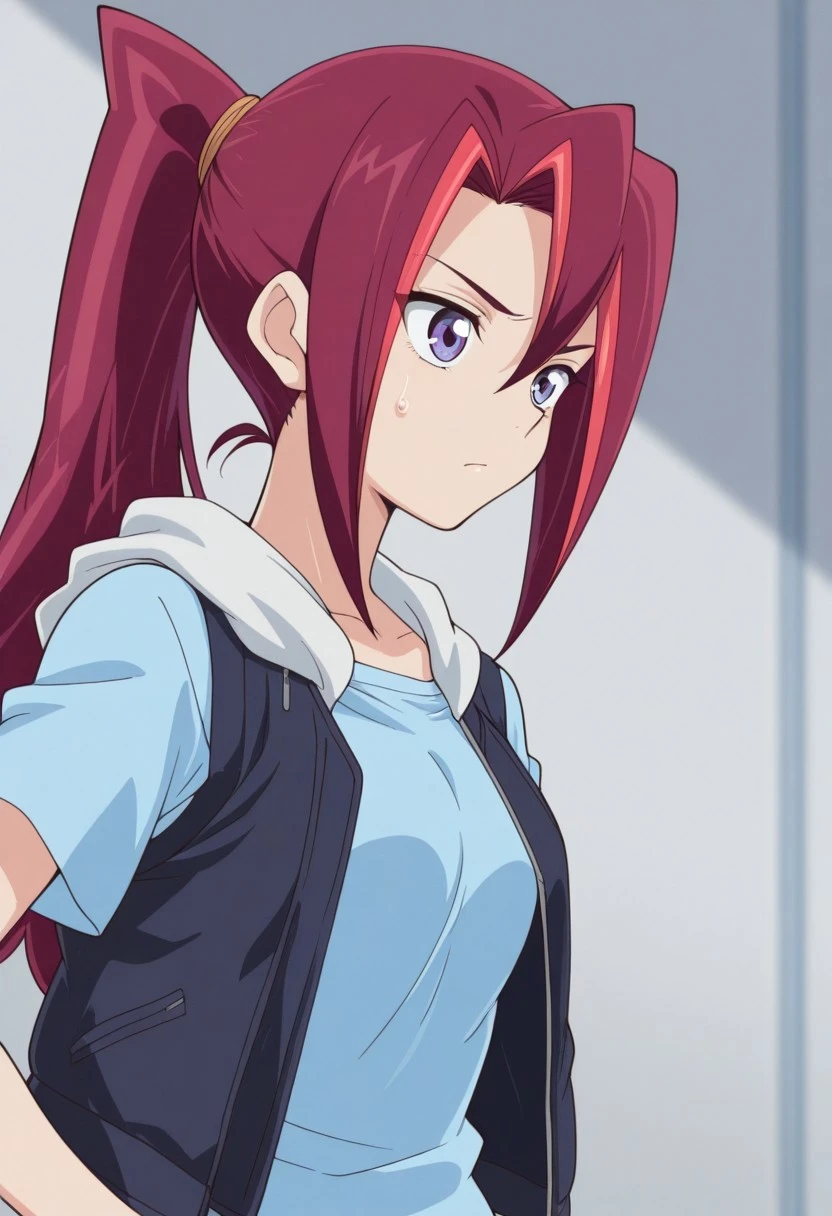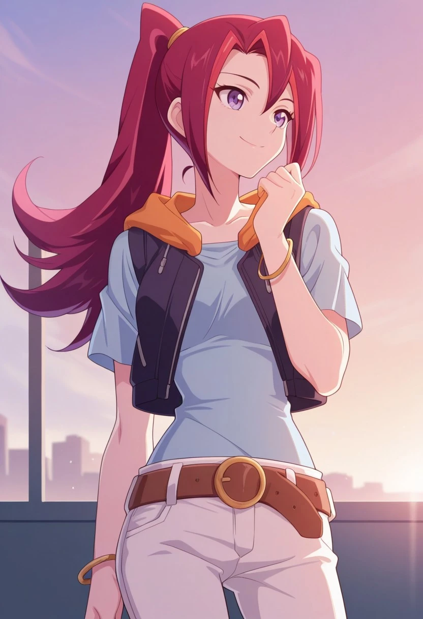 KariTsukumo, 1girl, solo, purple eyes, red hair, long hair, ponytail, multicolored hair, shirt, blue shirt, short sleeves, jacket, hood, sleeveless jacket, cropped jacket, jewerly, bracelet, belt, pants, white pants,