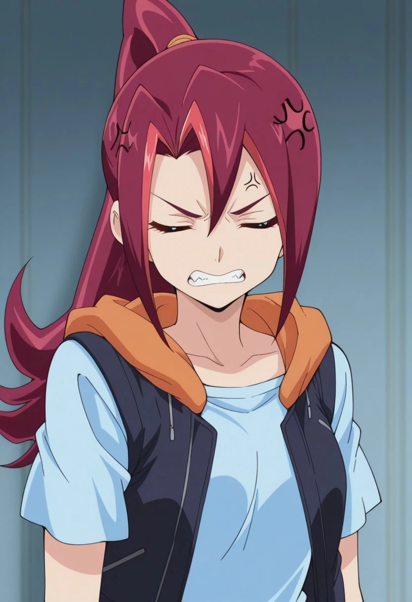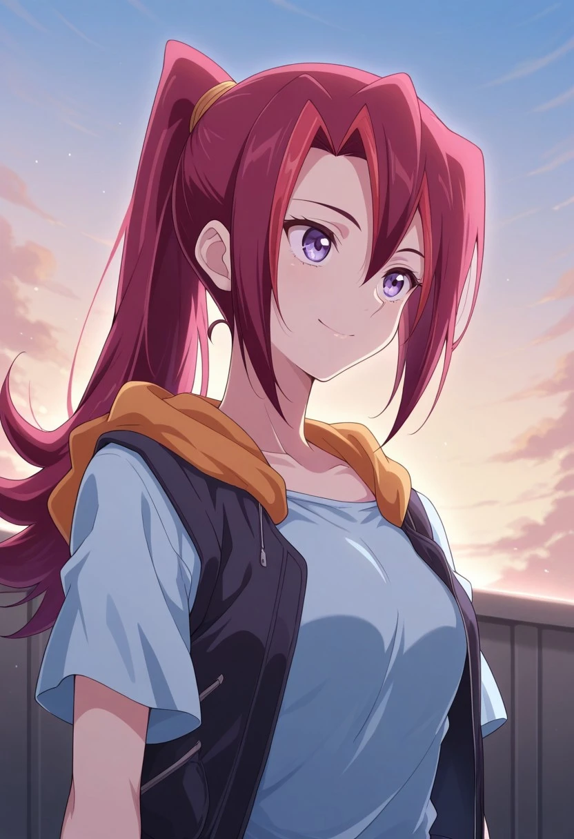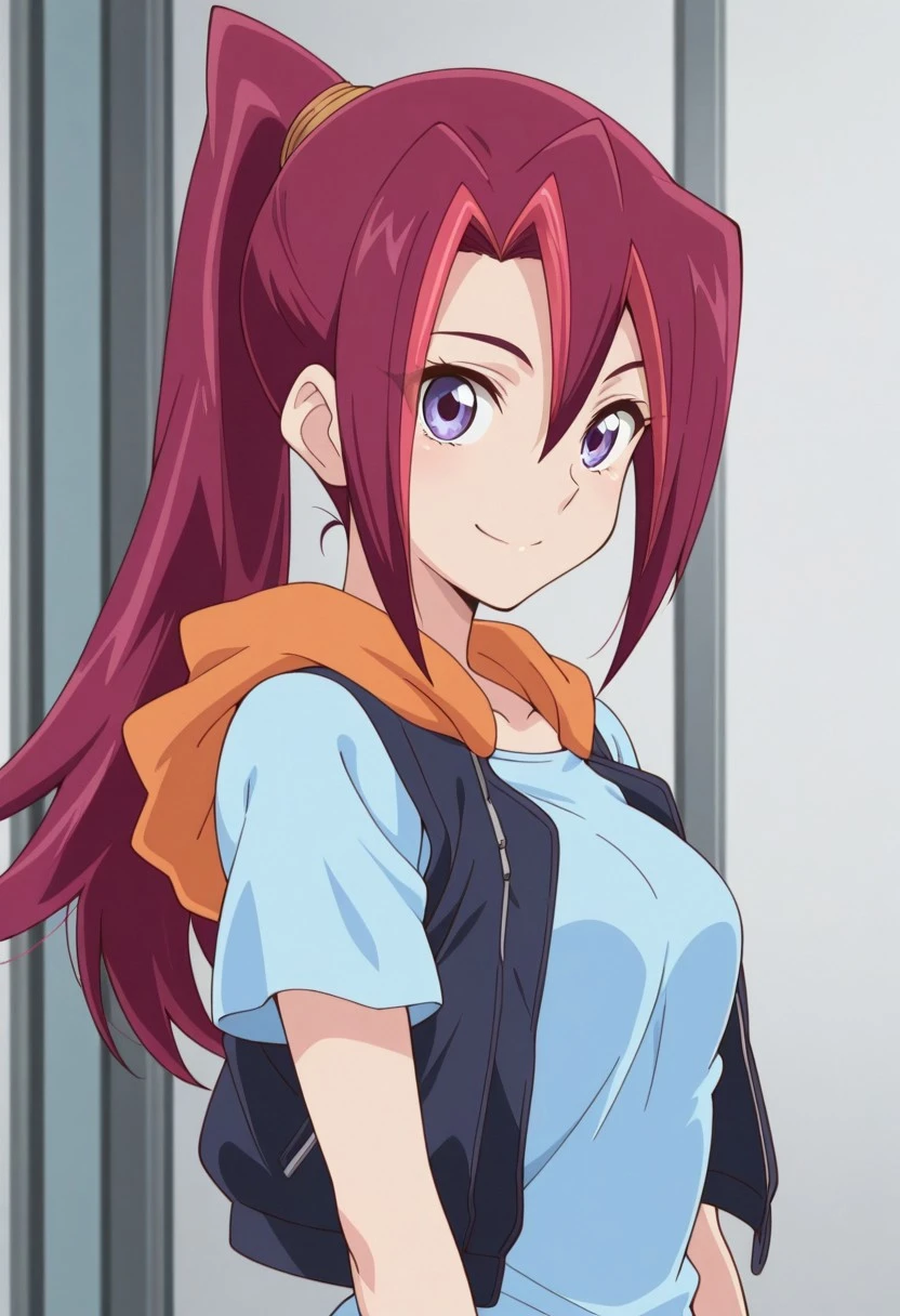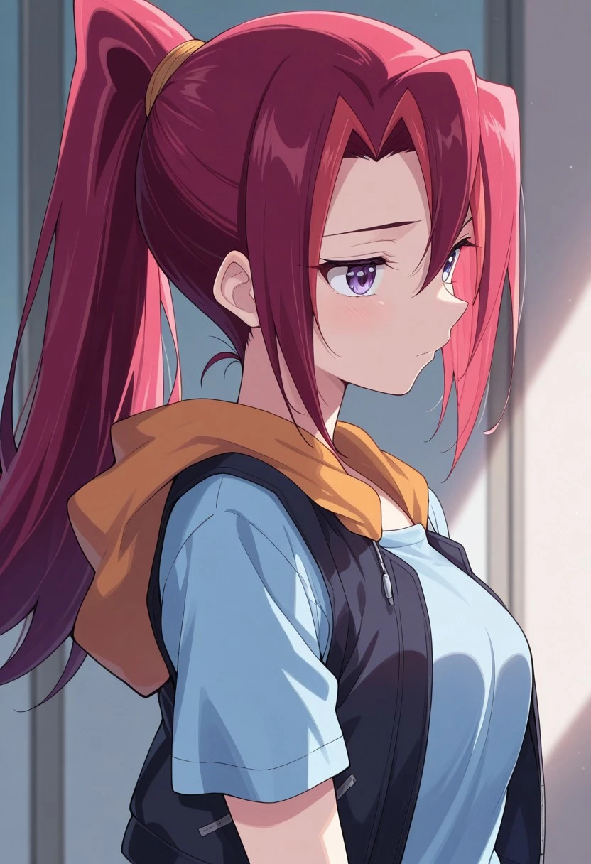 KariTsukumo, 1girl, solo, purple eyes, multicolored hair, two-tone hair, long hair, red hair, shirt, ponytail, blue shirt, belt, hood, short sleeves, purple hair, bangs, collarbone, hoodie, vest, breasts,