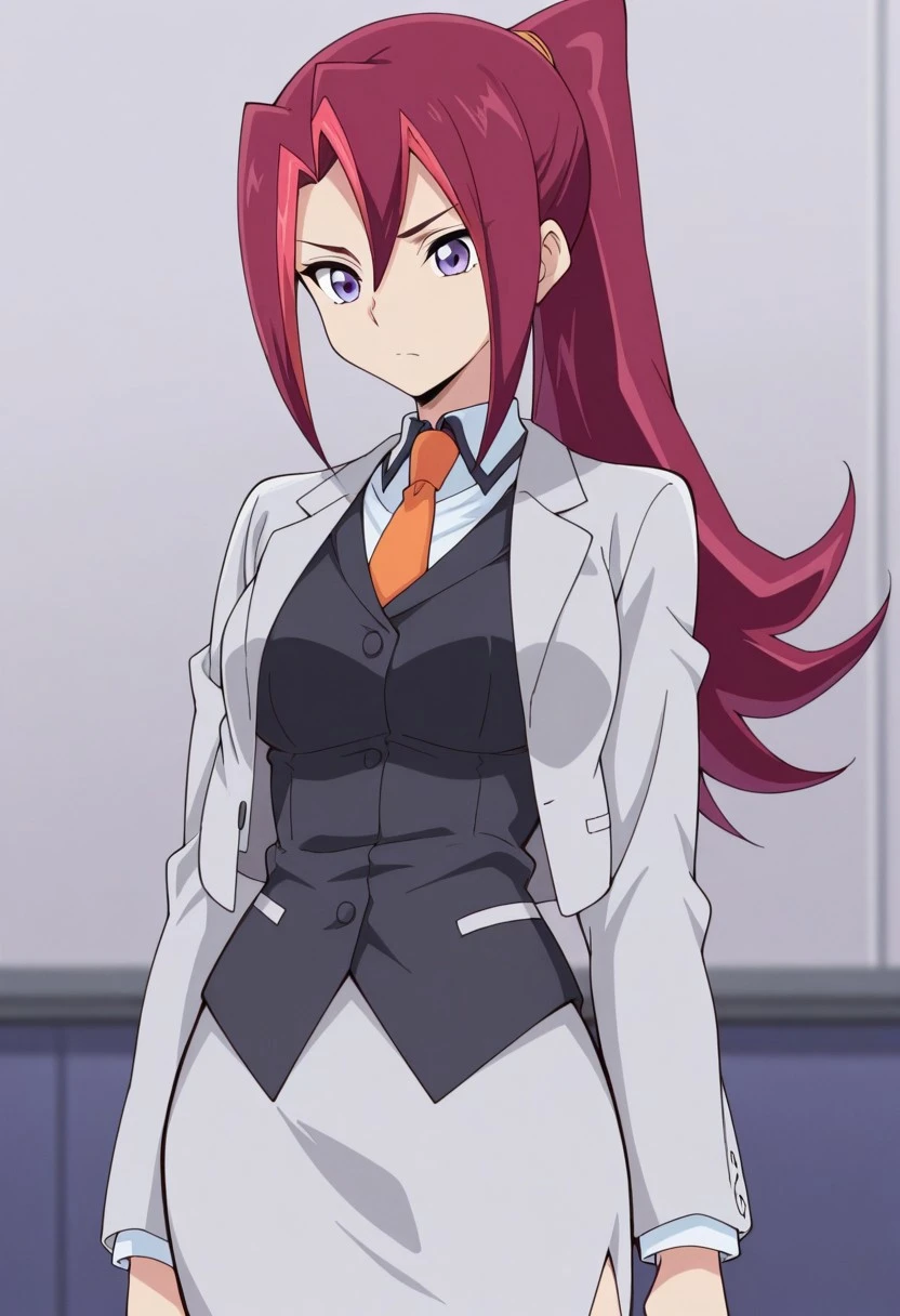 KariTsukumo, 1girl, solo, purple eyes, red hair, long hair, ponytail, multicolored hair, shirt, collared shirt, necktie, orange necktie, vest, black vest, jacket, grey jacket, skirt, grey skirt, pantyhose,