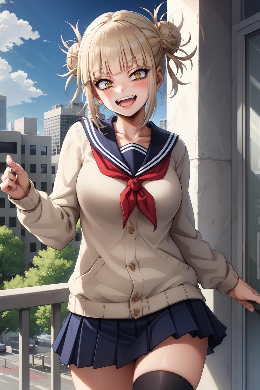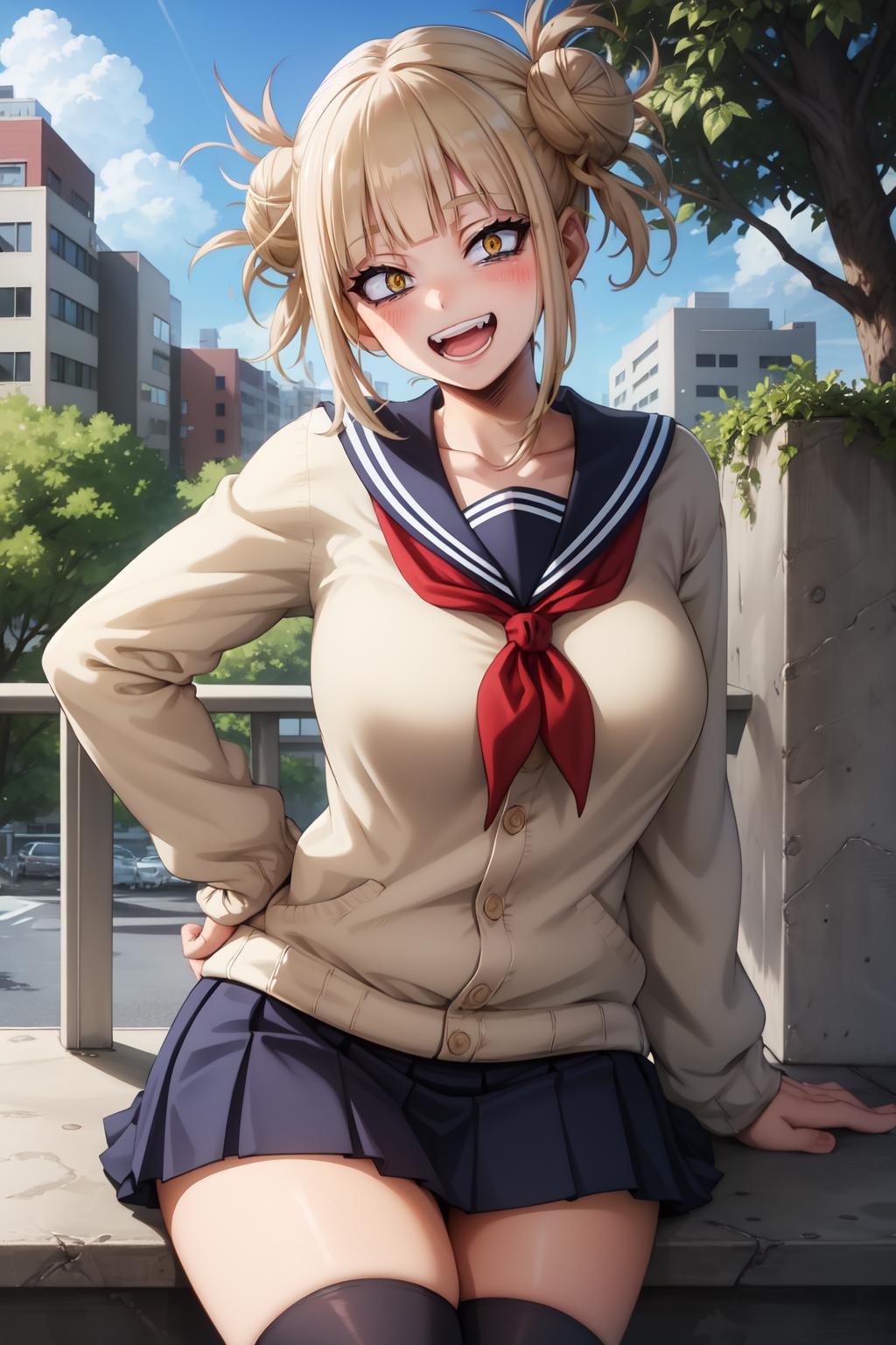 double bun, sidelocks, school uniform, sailor collar, red neckerchief, slit pupils, sharp teeths, pleated skirt, serafuku, cardigan, long sleeves, blue saillor collar, yellow eyes