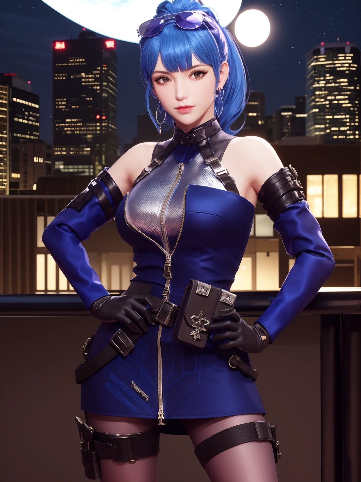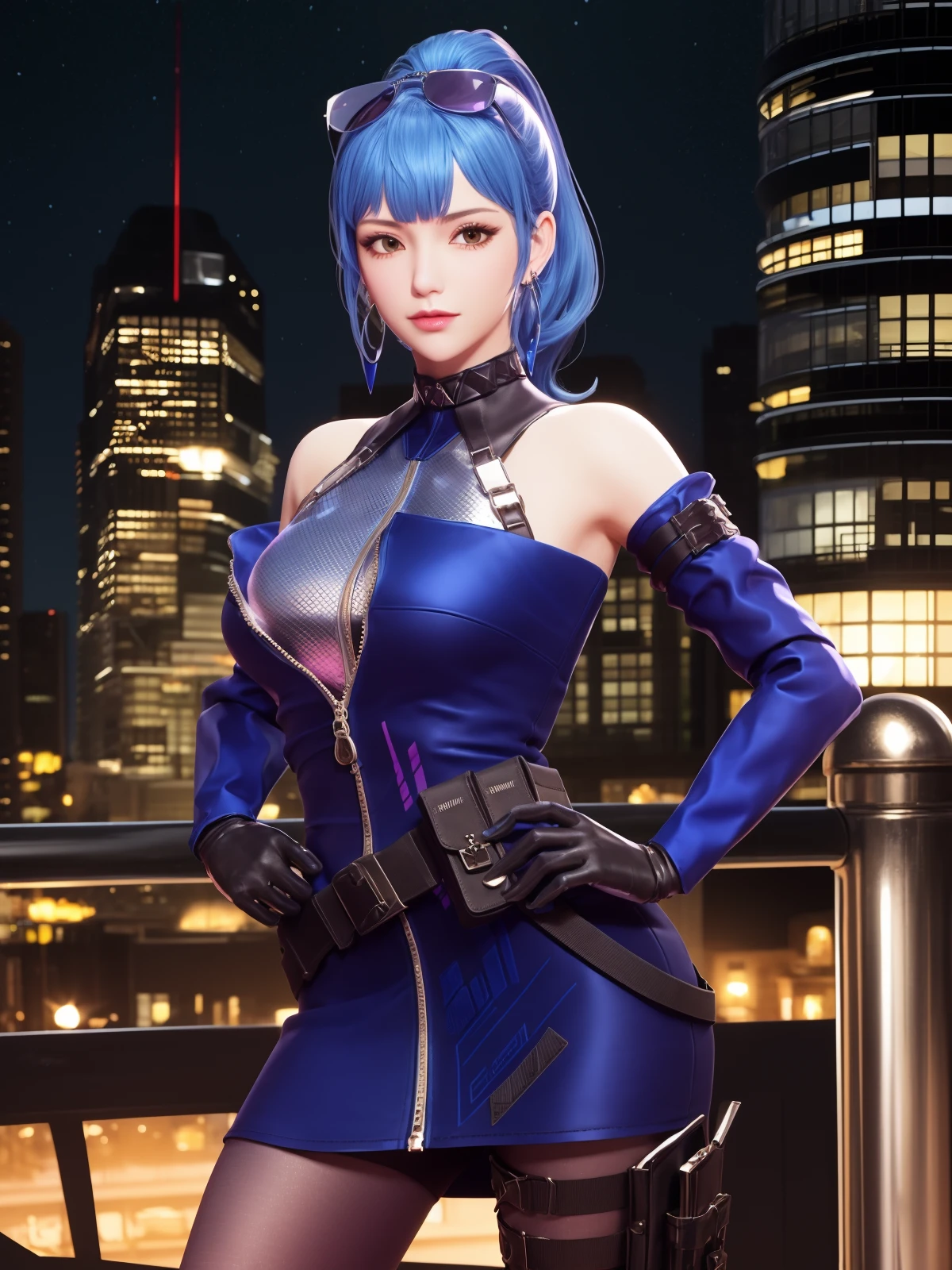 CFwumengmengBW, 1girl, solo, gloves,blue hair, dress, pantyhose, looking at viewer, jewelry, ponytail, bangs, earrings, bare shoulders, belt, detached sleeves, thigh strap, eyewear on head, pouch, high ponytail, holster, long hair,zipper,cityscape, night,