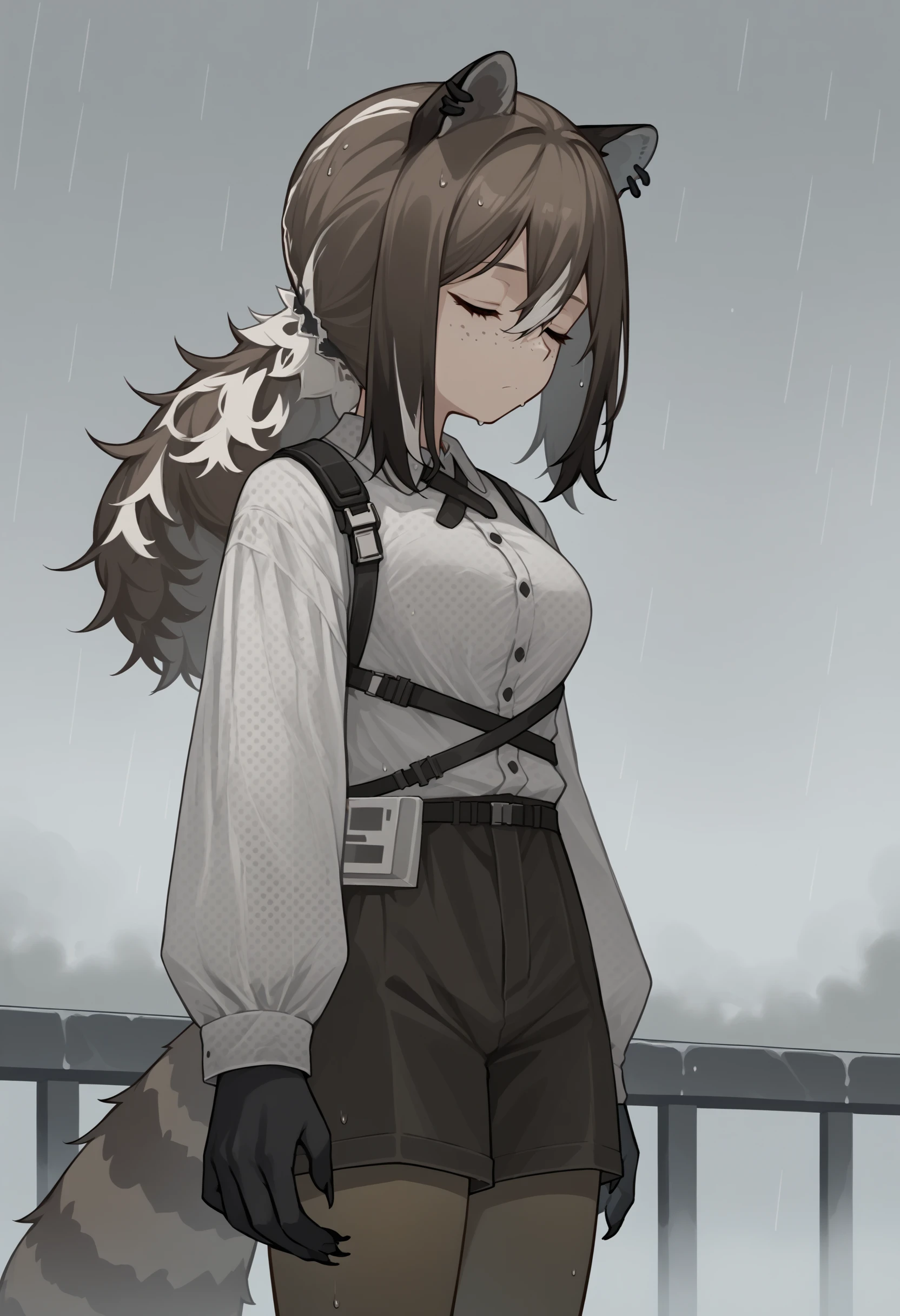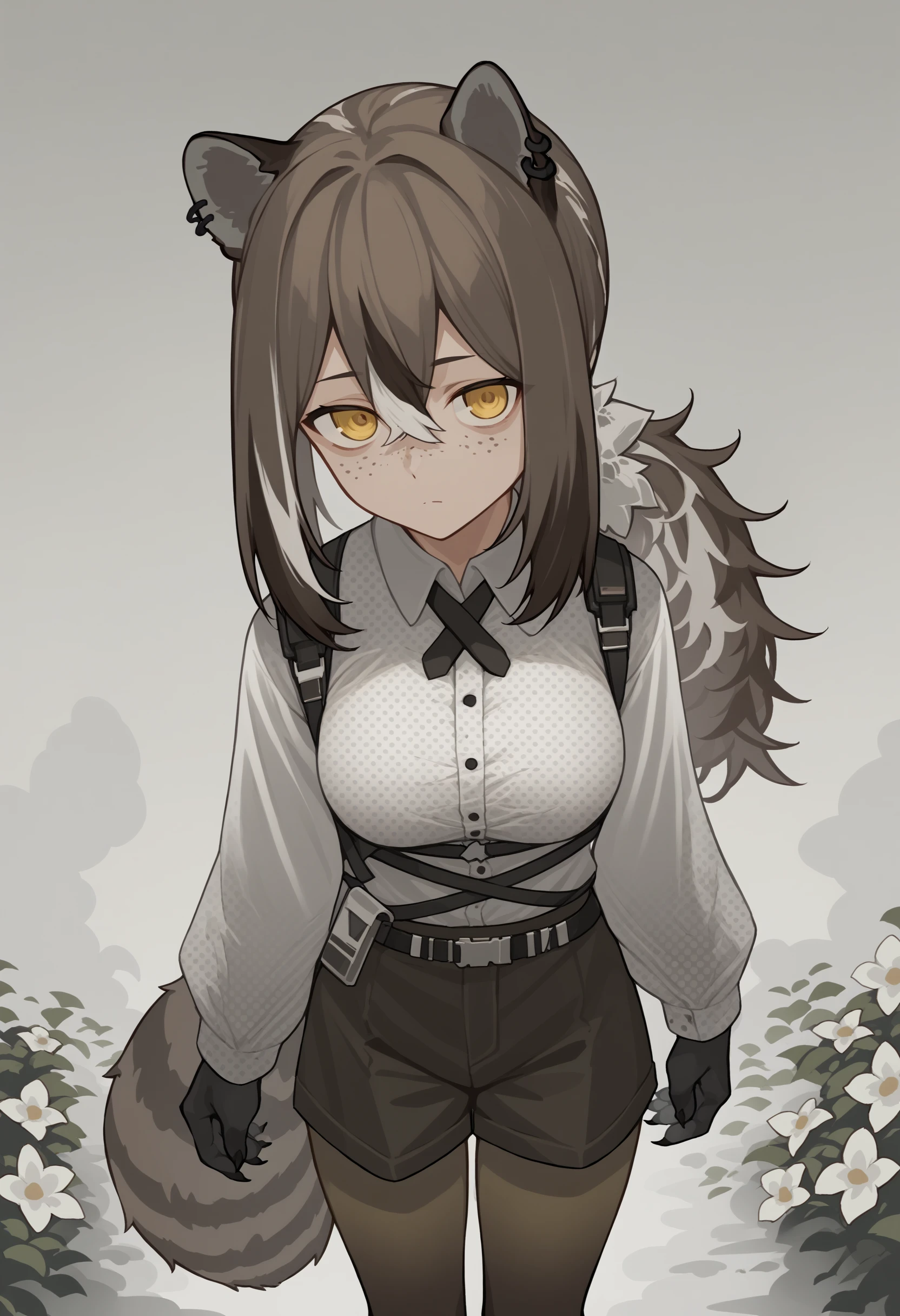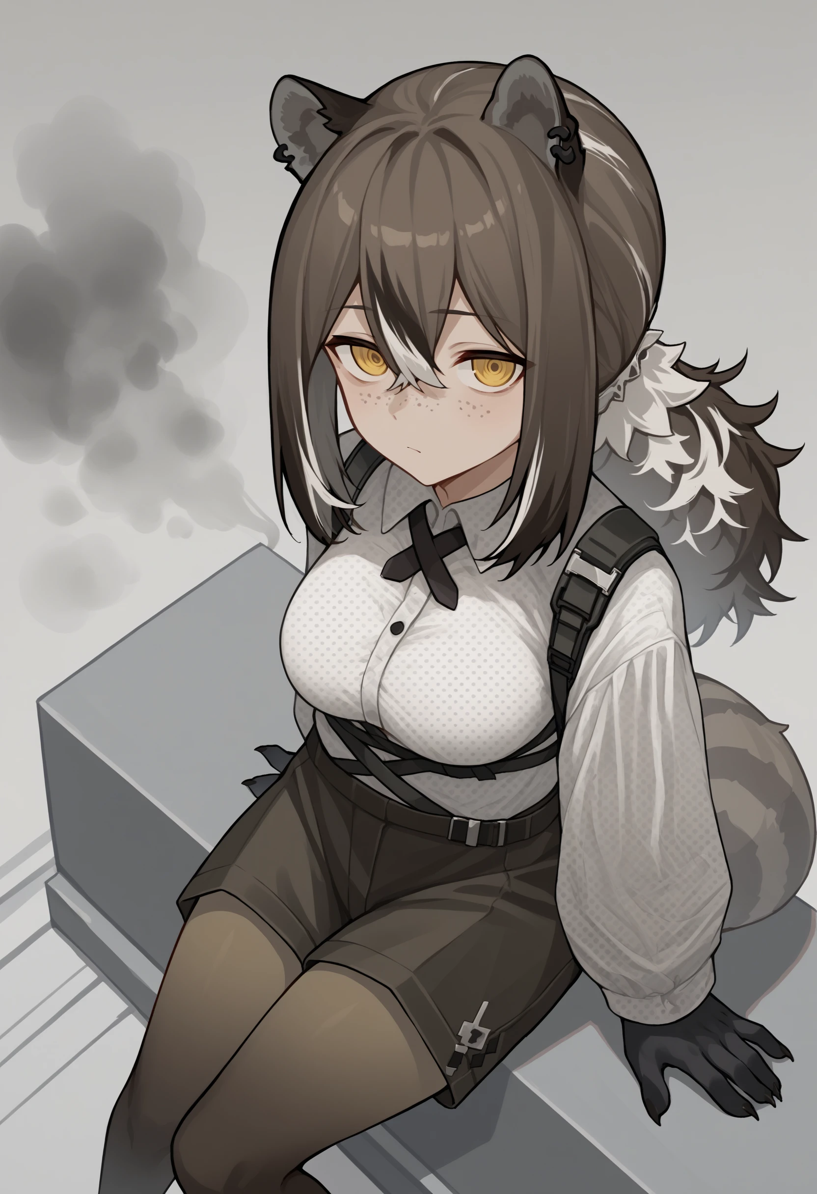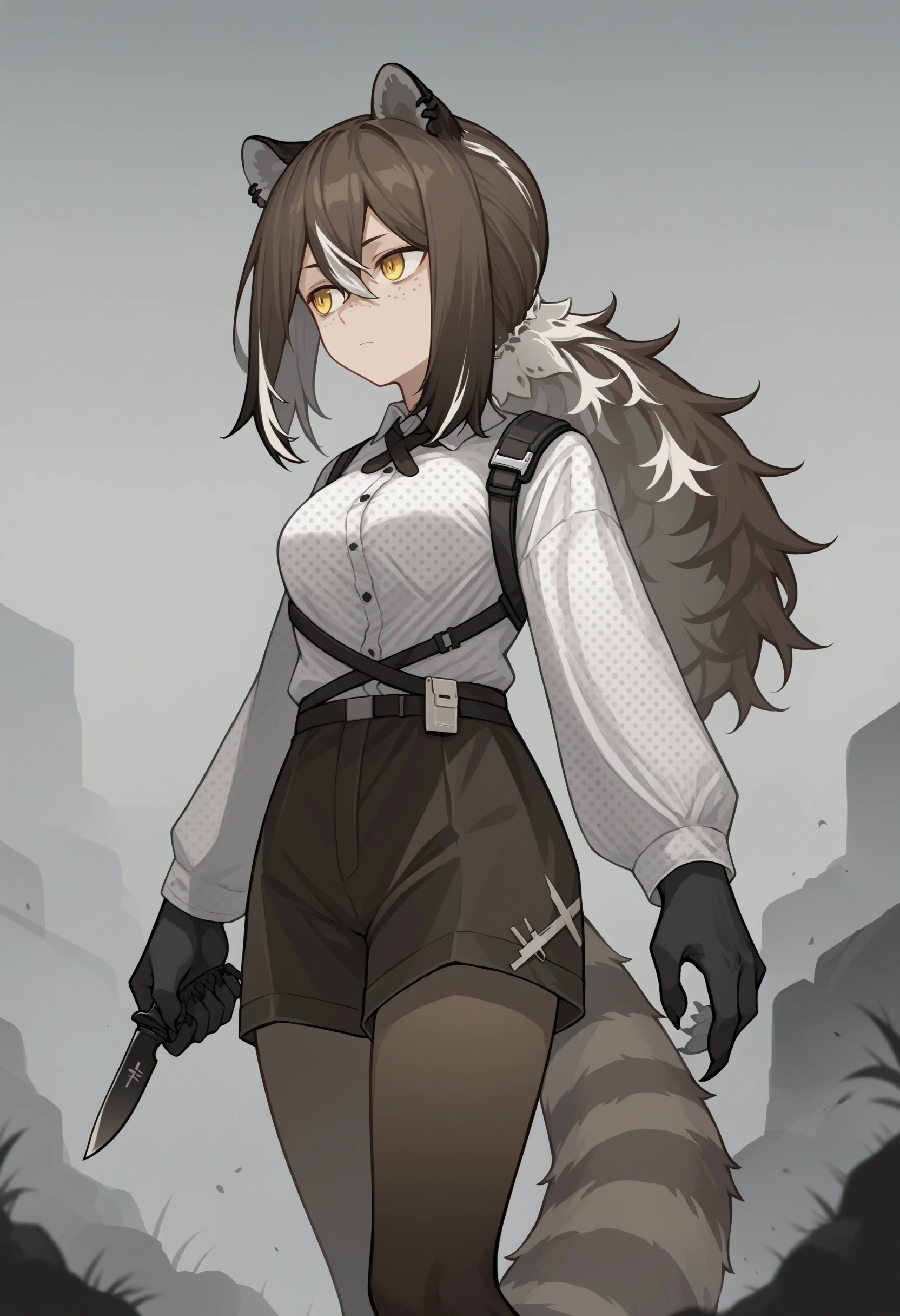rdef, raccoon girl, raccoon ears, animal ears, yellow eyes, freckles, brown hair, white hair, multicolored hair, hair between eyes, long hair, ponytail, animal hands, raccoon tail, tail, piercing, ear piercing, cross tie, white shirt, polka dot shirt, long sleeves, shorts, black shorts, brown pantyhose