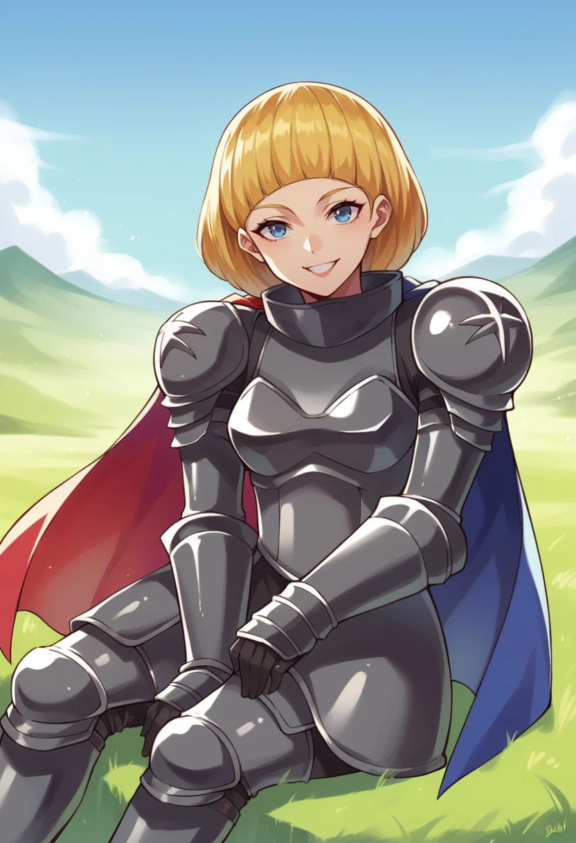 jeannesmt, blonde hair, short hair, blue eyes, armor, knight, greaves, red cape, blue cape