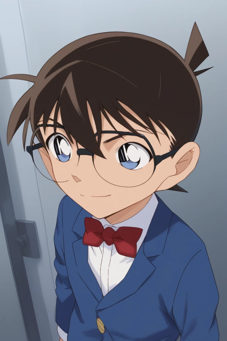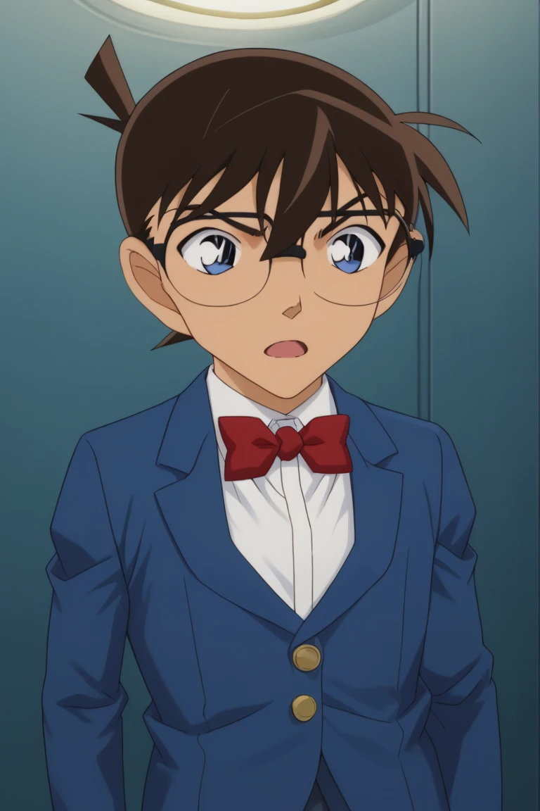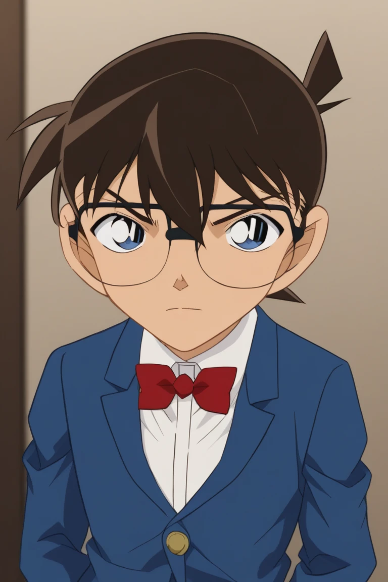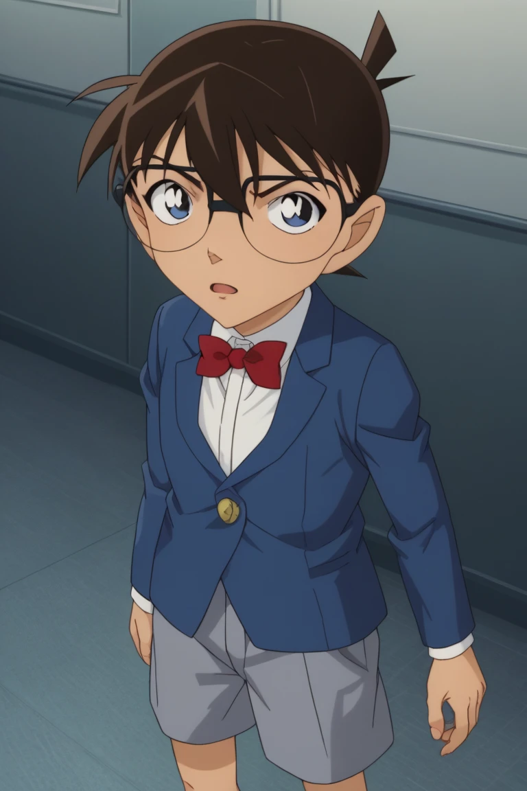 *blue vest, red bowtie, white shirt, dark blue shorts, red footwear