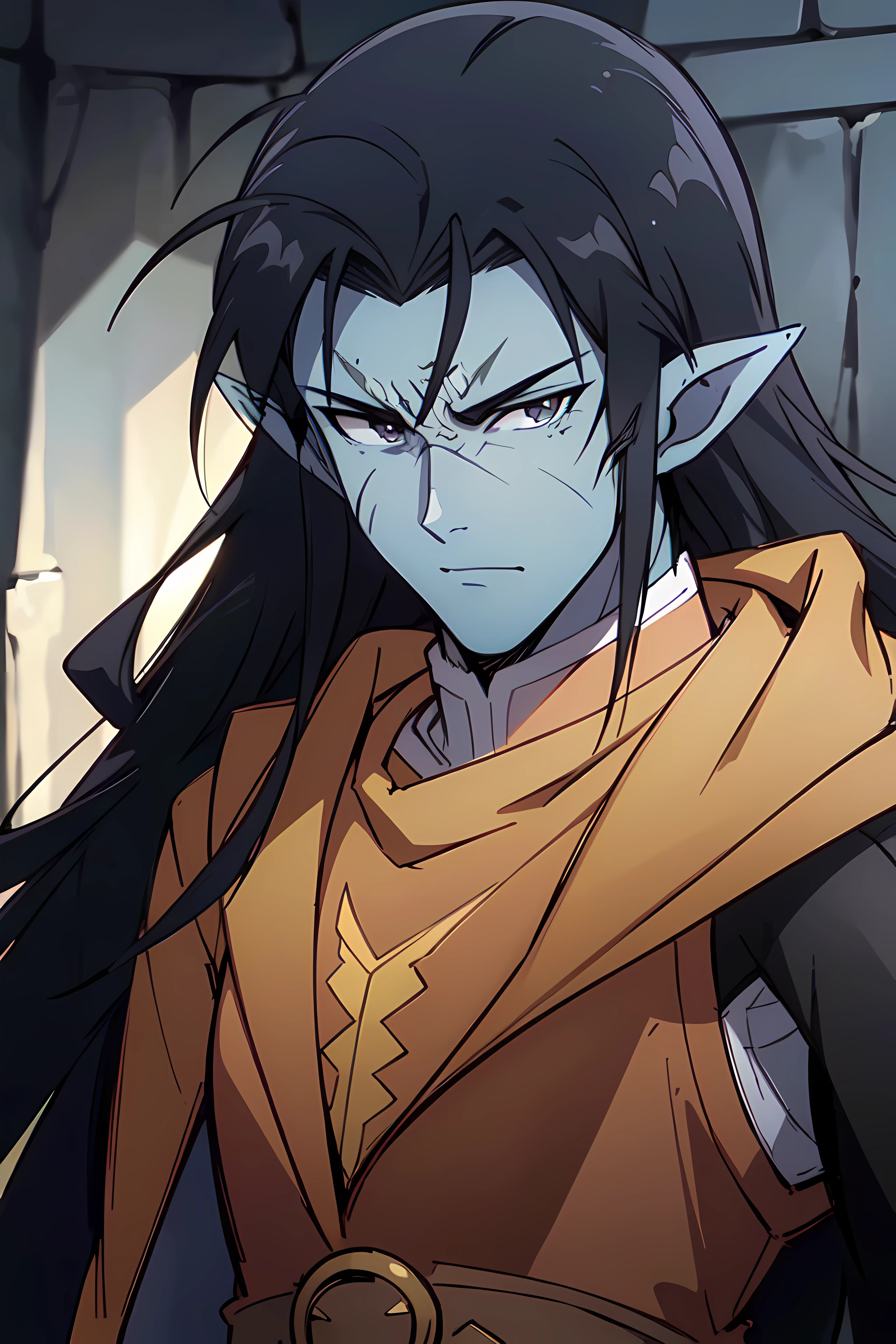 lonberuk_dqd,male focus, blue skin, black hair, long hair, pointy ears, face scar