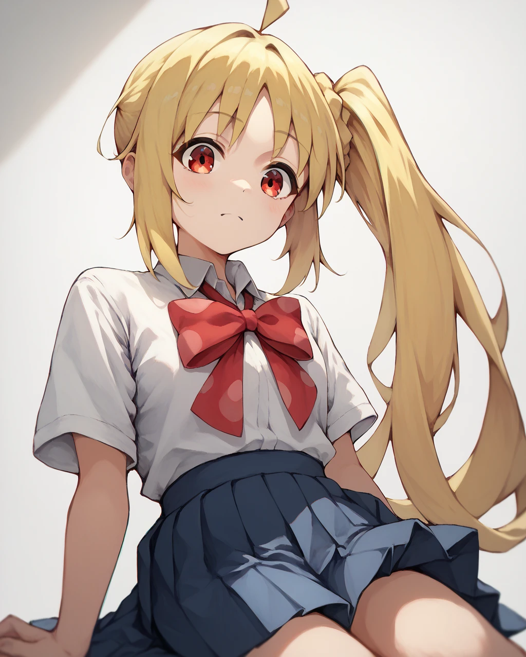 ijichi nijika, 1girl, solo, blonde hair, long hair,red eyes, ahoge, side ponytail,bangs,white shirt, school uniform, red bowtie, pleated skirt, blue skirt,