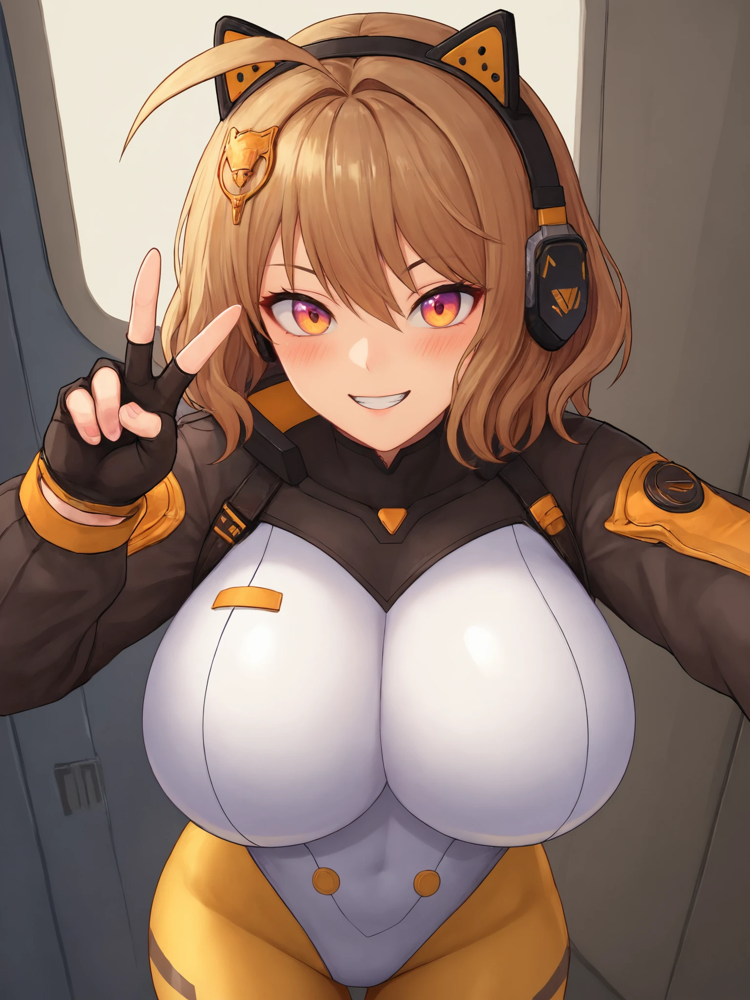 anis2ndannilivestream, yellow bodysuit, white leotard, shrug \(clothing\), long sleeves, black gloves, fingerless glovesbrown hair, wavy hair, medium hair, hair ornament, ahoge, animal ear earphones, hair between eyes, brown eyes, huge breastsDescription