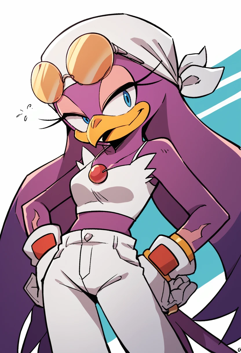 wave, gloves, eyewear on head, animal nose, bird beak, , furry female, purple hair, sunglasses, tinted eyewear, blue eyes, white pants, white top, white bandana, short top, golden rings on wrists, shoes,