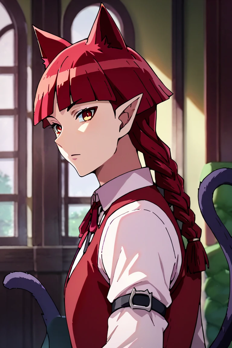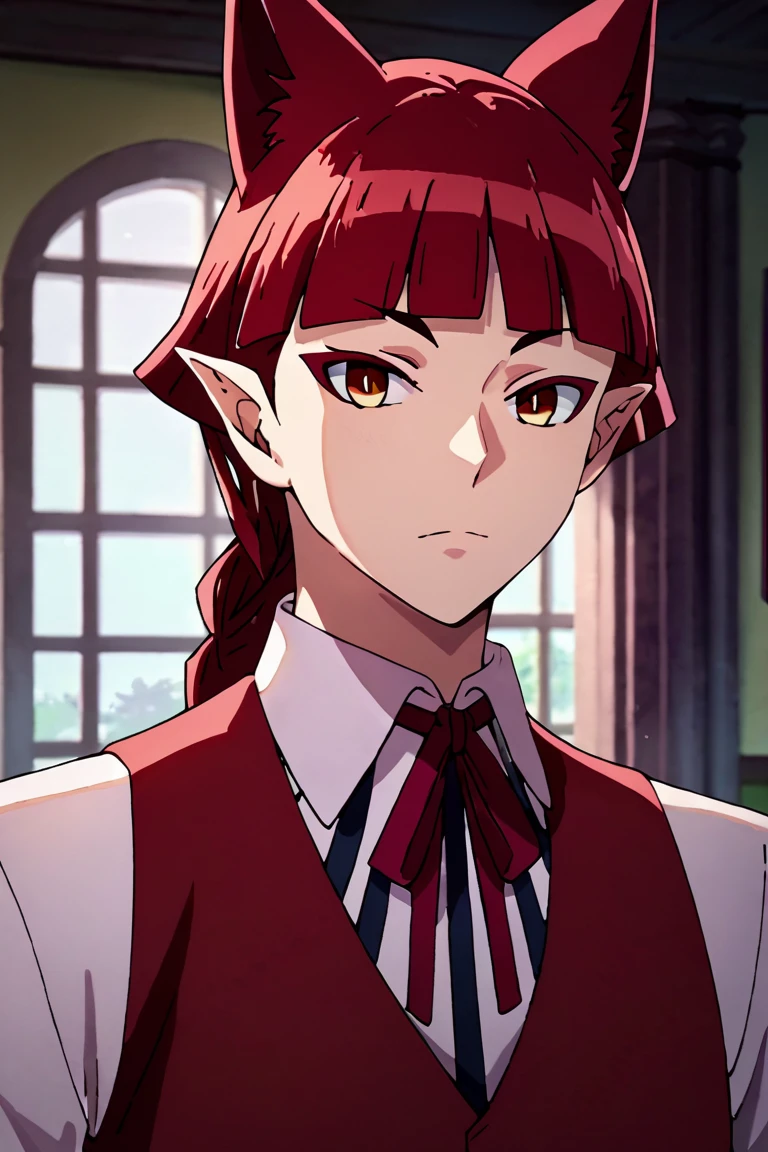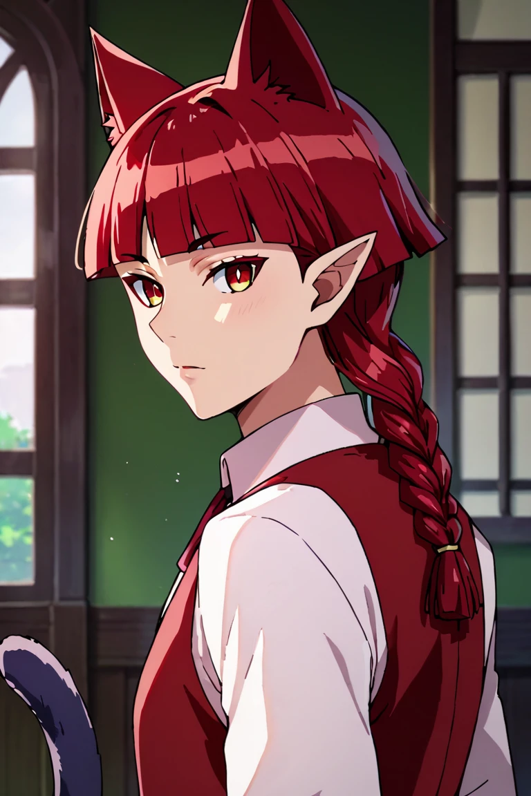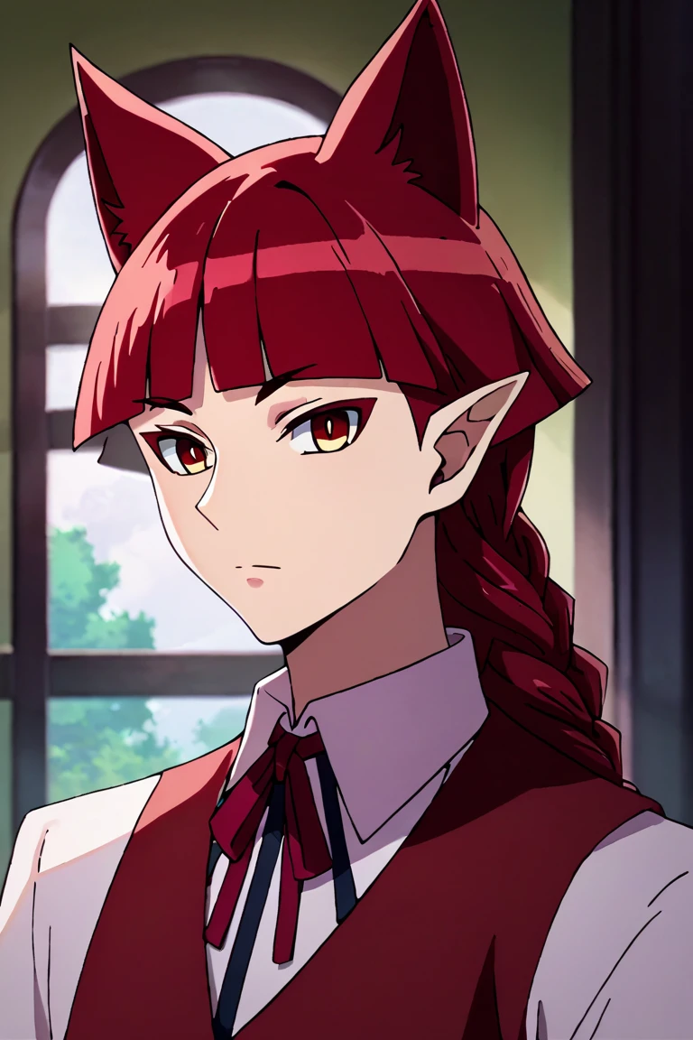Opera,red hair,red eyes,animal ears,braid,pointy ears,Neck ribbon,red vest, tail,cat tail,