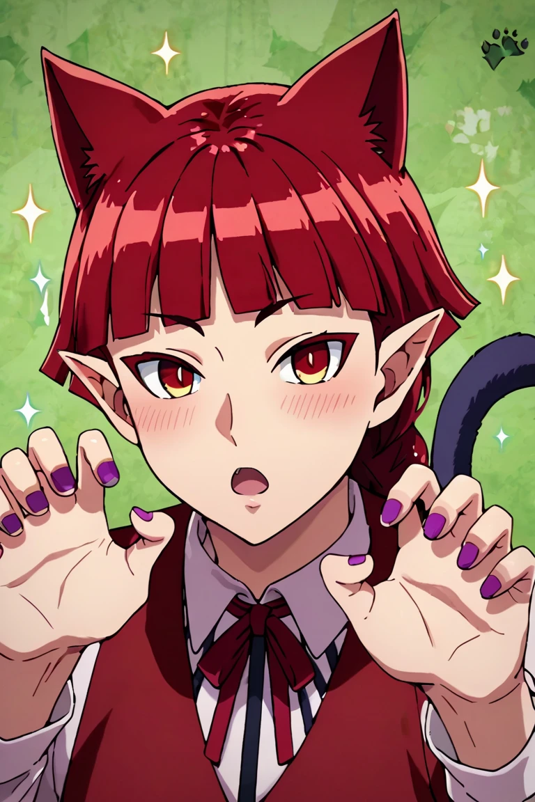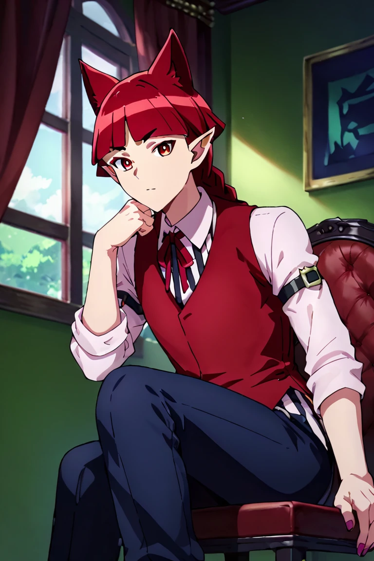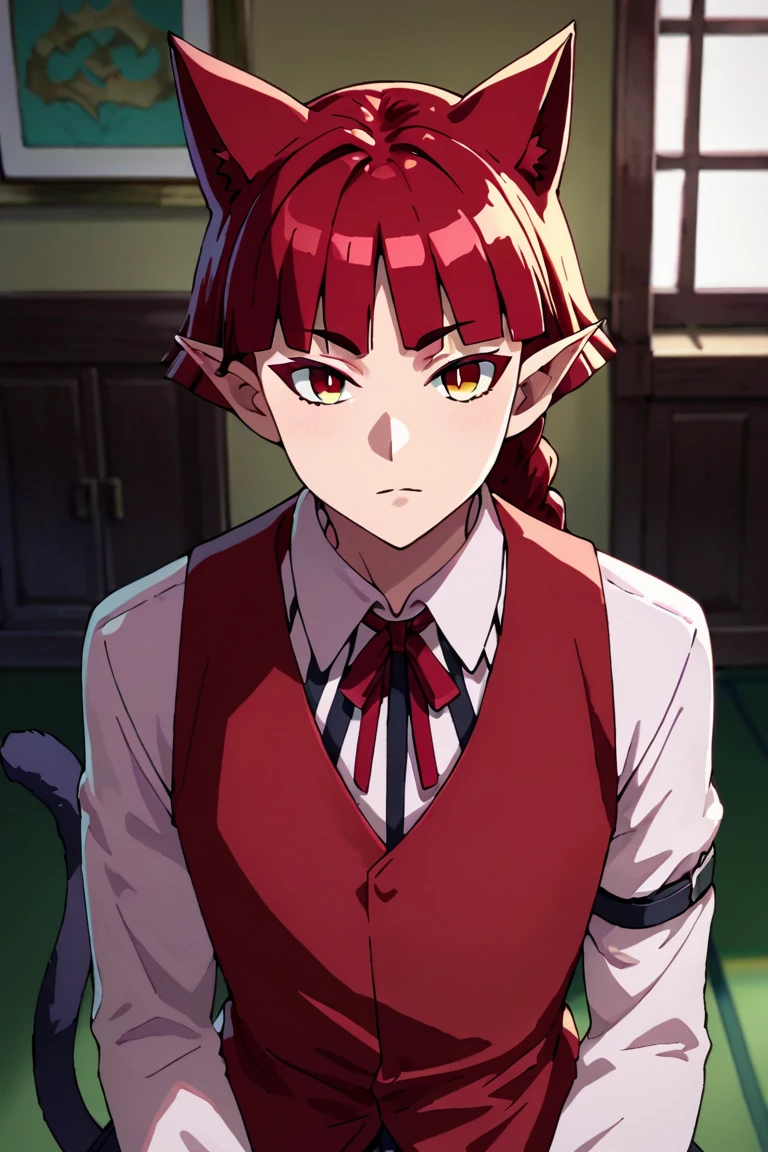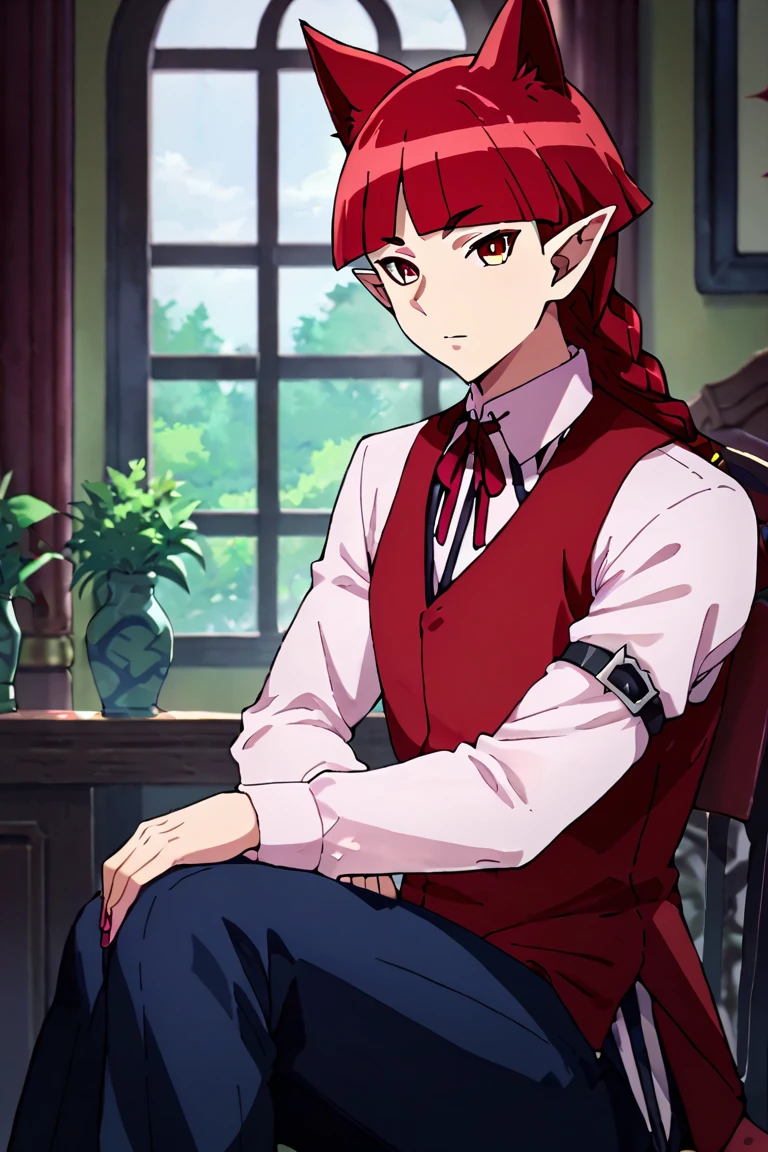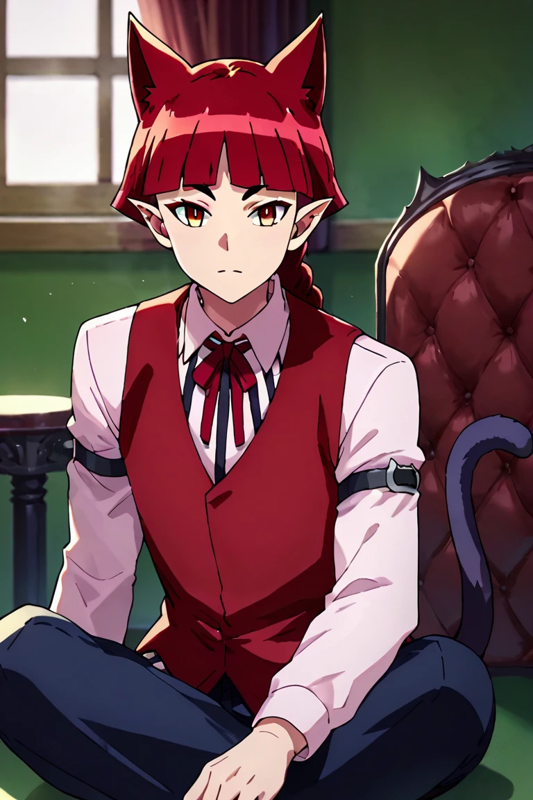 Opera,red hair,red eyes,animal ears,braid,pointy ears,Neck ribbon,red vest, tail,cat tail,