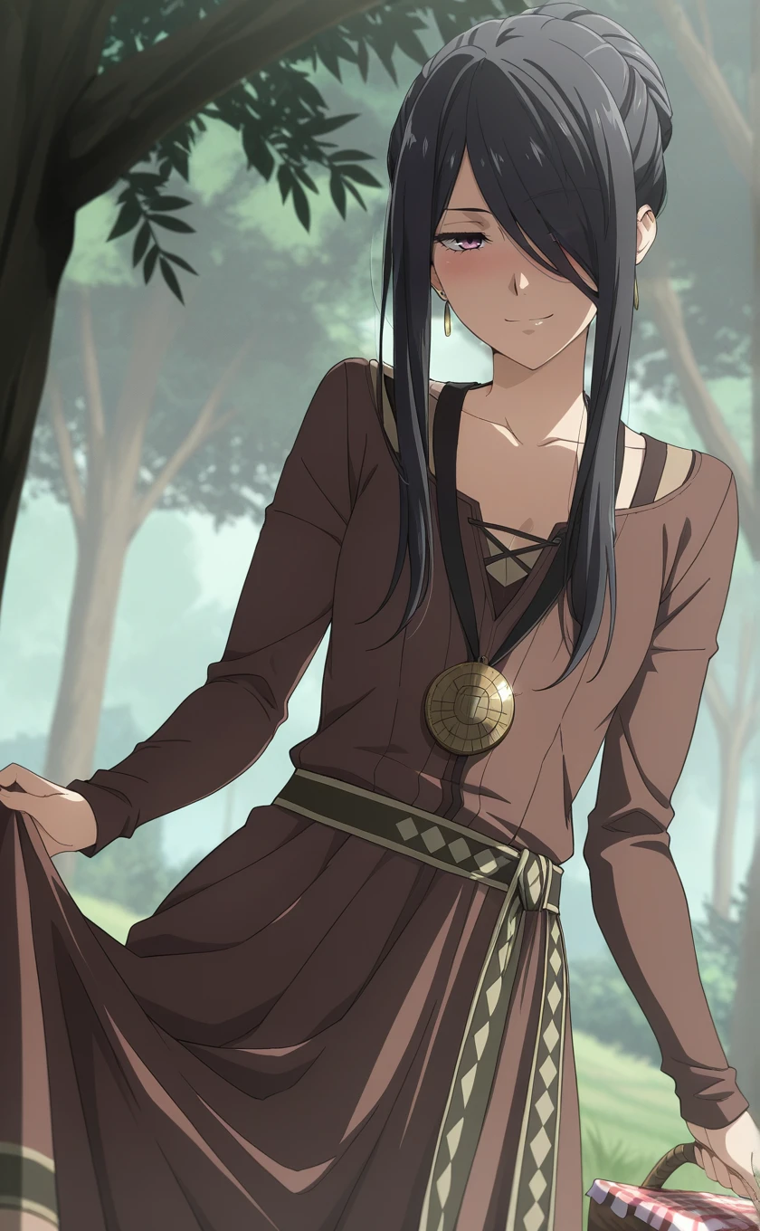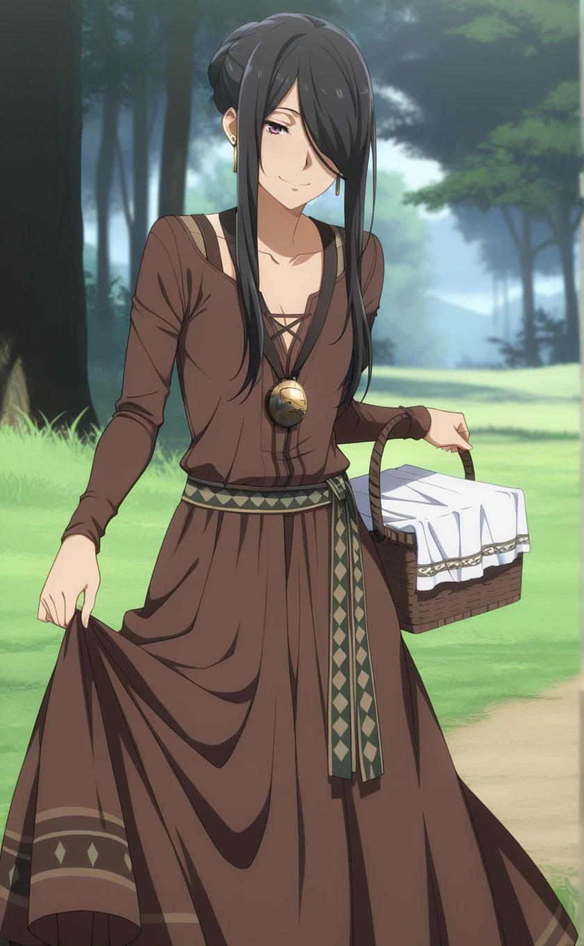 best quality,masterpiece,1girl,krstjgrth,anime coloring,solo,(black hair,purple eyes:0.8),{(glaring:0.85) | (half-closed eyes:0.8)},(eyelashes:0.9),flat chest,sidelocks,(yellow earrings:0.8), hair over one eye,long hair, hair bun, androgynous, shirt,collarbone,long sleeves, brown dress,medallion,long dress,outdoors, tree,skirt hold, holding picnic basket, grass,nature,smile,light blush,looking at viewer,sensitive, <lora:KurositsujiGrete:1>